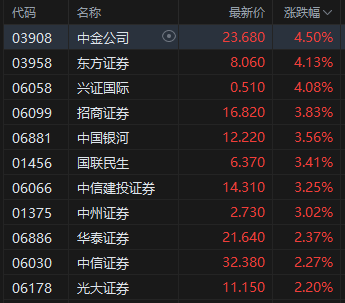 中资券商股活跃,招商证券涨超3%。多家机构指出,券商板块当前仍是“相对低估+业绩同比高增”的稀缺资产。开源证券认为,上市券商三季报有望超预期,投行、衍生品和公募业务将接续改善,头部券商ROE具备扩张潜力。