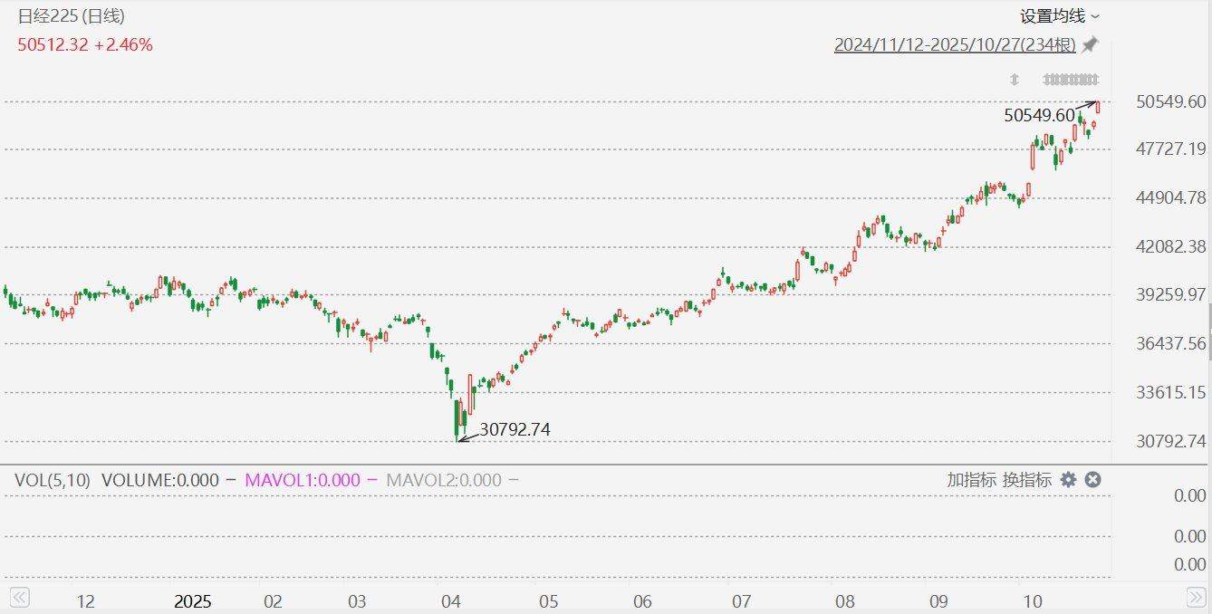 格隆汇10月27日|日经225指数收盘上涨1212.67点,涨幅2.46%,报50512.32点,首次收于5万点上方。日经225指数年内累涨26.61%。