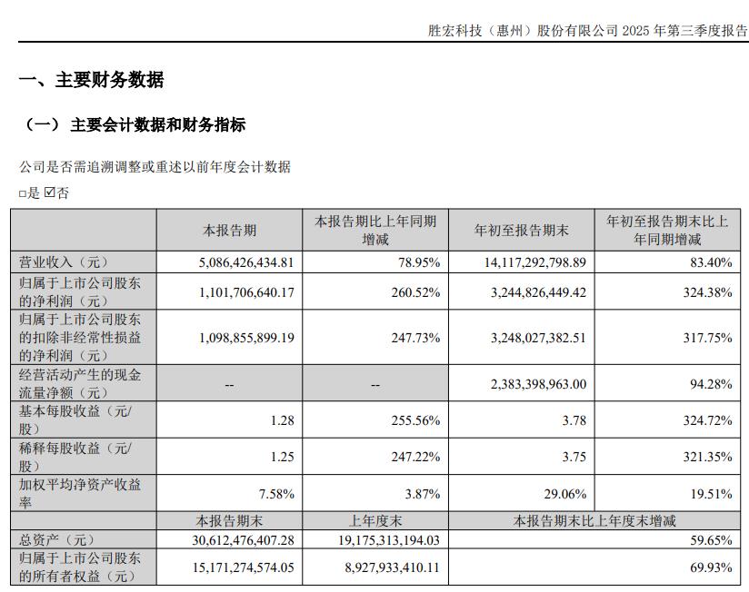 胜宏科技公告称,第三季度营收为50.86亿元,同比增长78.95%;净利润为11.02亿元,同比增长260.52%。前三季度营收为141.17亿元,同比增长83.40%;净利润为32.45亿元,同比增长324.38%。业绩增长主要系销售额增加所致。