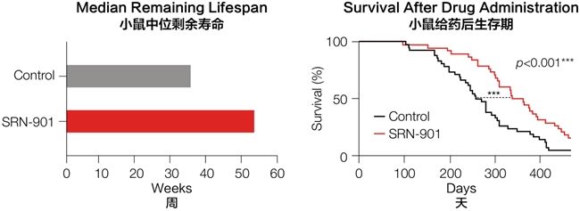 根据公开资料显示,作为瑞拓龄的原研方,赛诺根成立于2009年,早期主要聚焦于抗激素肿瘤药研发,曾长期为强生、罗氏开发原研药并提供技术输出。2016 年,赛诺根拓展业务方向,牵头哈佛大学、梅奥诊所等顶尖科研机构成立多家合资公司。时至今日,其业务已涵盖制药、诊断、营养品和生物化工多个领域,重点研究与衰老相关的分子机制。 2024年,赛诺根公布了旗下第二款衰老干预候选药SRN-901的临床前实验数据。作为迄今为止全球范围内最全面深入的衰老抑制剂疗效评估,该项实验覆盖实验动物全生命周期内从寿命长度到身体机能、血液指标,再到细胞分子层面的全转录组分析、蛋白质组学、代谢组学,乃至生物信息学层面的机器学习建模等各个领域。 数据显示,从小鼠中年(相当于人类50多岁)开始给药,SRN-901组实验动物的剩余寿命破纪录地延长了33.02%;老年小鼠体能从不足年轻时的20%提升至50%,皮肤、毛发、运动机能等生理功能的衰退均被显著抑制,达到了目前口服衰老抑制剂的最高水平。