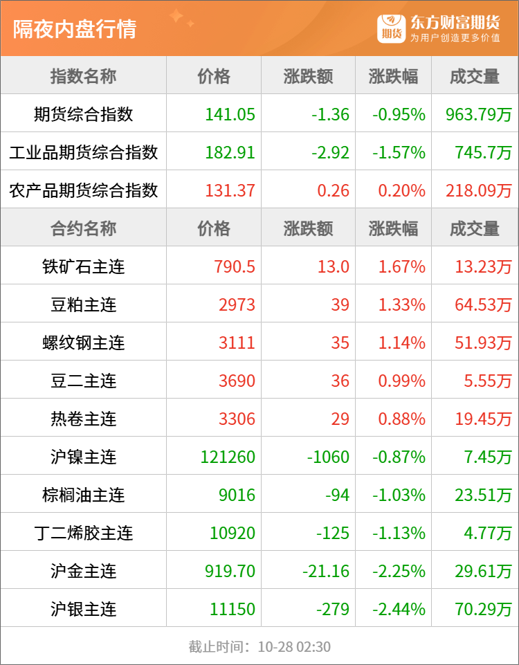 隔夜行情![]() ![]() 每日精选外交部回应中美经贸磋商:双方同意进一步确定具体细节 国内成品油价今晚(10月27日)下调 加满一箱油少花10.5元 10月进口猪肉成交活跃度下降 价格缓跌为主 宏观产经新华社:10月27日,中共中央政治局委员、外交部长王毅同美国国务卿鲁比奥通电话。王毅表示,前段时间,中美经贸关系再次出现波折。通过吉隆坡经贸会谈,双方澄清了立场,增进了理解,就对等解决当前紧迫的经贸问题达成框架共识。希望双方相向而行,为中美高层互动做好准备,为两国关系发展创造条件。 财联社:2025金融街论坛年会27日起至30日在北京金融街举行,今年论坛的主题为“创新、变革、重塑下的全球金融发展”。27日下午,2025金融街论坛年会开幕式上,中国人民银行行长潘功胜表示,目前,债市整体运行良好,人民银行将恢复公开市场国债买卖操作。人民银行将进一步优化数字人民币管理体系,研究优化数字人民币在货币层次之中的定位,支持更多商业银行成为数字人民币业务运营机构。 界面新闻:中国证监会研究起草了《关于加强资本市场中小投资者保护的若干意见》,并于今天正式发布。其中提到,推动上市公司增强投资者回报,大力倡导上市公司采用“注销式回购”等方式回报投资者。进一步加强程序化交易监管,维护市场交易的公平性。依法从严打击内幕交易、操纵市场、违规减持上市公司股份、短线交易、非法证券期货投资咨询、通过自媒体平台等渠道编造传播虚假信息或者误导性信息等扰乱证券期货市场秩序的违法行为。 品种资讯黑色系期货 铁矿石:2025年10月20日-10月26日Mysteel全球铁矿石发运总量3388.4万吨,环比增加54.8万吨。澳洲巴西铁矿发运总量2925.9万吨,环比增加100.8万吨。澳洲发运量1984.3万吨,环比减少0.2万吨,其中澳洲发往中国的量1666.5万吨,环比减少62.6万吨。巴西发运量941.5万吨,环比增加101.0万吨。 唐山地区因环保要求,计划于27日对高炉实施为期4天、限产30%的措施。截至10月24日,唐山地区钢厂日均铁水产量39.69万吨,若按照高炉限产30%估算,日均铁水产量影响9.1万吨,按4.5天计算共影响铁水产量40.95万吨,涉及建筑钢材钢厂影响有限,其中TSDH预计日均影响铁水0.8万吨。螺纹产线方面,整体产量基本不变,仍维持一天0.8-1万吨水平。(我的钢铁网) 焦煤:27日鄂尔多斯地区部分民营煤矿完成当月生产任务停产减产,市场煤炭供应稍有收紧,当前下游用户采购节奏有所放缓,叠加周末主力站台外购价格下调,市场观望情绪加剧,部分煤矿为刺激销售小幅下调煤价。现Q5500坑口含税报560-600元/吨,Q5000坑口含税报420-490元/吨,Q4500坑口含税报350-410元/吨。(我的钢铁网) 农产品期货 生猪:商务部贸易救济调查局发布关于召开相关猪肉及猪副产品反倾销案听证会的进一步通知。听证会时间为2025年10月31日(星期五)9:00,地点为北京市东长安街2号商务部1号楼8层会议室。(第一财经) 据农业农村部监测,截至10月27日14:00时,全国农产品批发市场猪肉平均价格为17.96元/公斤,比上周五上升1.3%;鸡蛋7.39元/公斤,比上周五上升0.3%。(农业农村部) 大豆:咨询机构AgRural周一(10月27日)表示,截至上周四(10月23日),巴西2025/26年度大豆播种率已经达到预期的36%。此外,巴西2025/26年度一茬玉米的播种面积已达到中南部地区计划种植面积的55%。(新华财经) 棕榈油:南部半岛棕榈油压榨商协会(SPPOMA)数据显示,2025年10月1-25日马来西亚棕榈油单产环比上月同期增加1.63%,出油率环比上月同期增加0.22%,产量环比上月同期增加2.78%。 马来西亚独立检验机构Amspec表示,马来西亚10月1-25日的棕榈油出口量为1182216吨,较上月同期环比减少0.27%。(新华财经) 有色/贵金属期货 贵金属:路透调查预计2025年黄金均价将达到每盎司3400美元,高于此前调查的每盎司3220美元;预计2025年白银均价将达到每盎司38.45美元,此前为每盎司34.52美元;受经济和地缘政治动荡支撑,黄金避险吸引力依然强劲,预计2026年黄金均价为每盎司4275美元,白银均价为每盎司50美元。(新华财经) 氧化铝:据国际铝业协会(IAI),2025年9月份全球氧化铝产量为1288.4万吨,去年同期为1199.3万吨,前一个月修正值为1332.1万吨。预计9月中国氧化铝产量为795.0万吨,前一个月修正值为803.0万吨。(新华财经) 沪镍:路透调查预计2025年镍市场过剩19.1万吨,2026年过剩15.65万吨。预计LME镍2025年均价15318美元/吨,2026年为15755美元/吨,低于2024年的16813美元/吨。(新华财经) 多晶硅:10月多晶硅产量预计13.4万吨左右,环比9月出现增加,超出此前市场预期,11月部分头部企业将减产,产量有下滑预期。上周国内组件企业报价小幅震荡,近期部分省份装机项目开始小幅增加,11月部分组件厂接单增多,原定大幅减产计划将有所调整,11月预计整体减产量较预期有所减少。(上海有色网) 能化期货 尿素:山东地区尿素行情涨势趋缓,小颗粒主流出厂成交1560-1600元/吨,大颗粒出厂成交1750-1780元/吨。临沂市场一手贸易商出货参考价格1610元/吨附近,菏泽市场参考价格1580元/吨附近。日月装置预计月底恢复,省内其它企业基本正常。(隆众资讯) 烧碱:周末,山东主要下游采购32碱下调10至730,省内多数企业价格跟跌10-20不等,月底多数企业库存增加,走货显疲软。鲁西南32%离子膜碱主流成交790-830;鲁中东部32%离子膜碱主流成交760-810,50%离子膜碱主流成交1230-1330;鲁北地区32%离子膜碱主流成交790-860;鲁南32%离