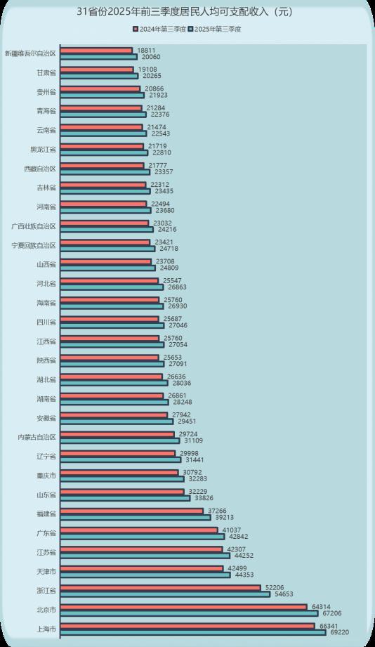 31省份前三季度居民“赚钱”排行榜:沪京浙领跑 11地超3万元 全新妙想投研助理,立即体验 中国网财经10月28日讯国家统计局近日公布了31个省份2025年前三季度居民人均可支配收入数据。中国网财经梳理发现,上海、北京、浙江三地稳居前三,成为全国居民收入的“第一梯队”。今年前三季度,全国有11省份居民人均可支配收入超过3万元大关,比上年同期新增辽宁和内蒙古。 国家统计局数据显示,前三季度,全国居民人均可支配收入32509元,比上年同期名义增长5.1%,扣除价格因素,实际增长5.2%。 ![]() 数据来源:国家统计局中国网财经畅帅帅制表 在中国各地居民人均收入版图上,上海和北京双双突破6.5万元大关,遥遥领先其他省份。上海以居民人均可支配收入69220元位居全国榜首,北京以67206元紧随其后。浙江以54653元的成绩位居第三名,与上海、北京共同构成收入的“第一梯队”。 天津(44353元)、江苏(44252元)和广东(42842元)三省均超过4.2万元,分别位列第四至第六名;福建以39213元位居第七,而山东(33826元)、重庆(32283元)、辽宁(31441元)和内蒙古(31109元)则位列第八至第十一名,均超过了3万元大关;另有20个省份跃过两万元“阶梯”,其中安徽(29451元)、湖南(28248元)、湖北(28036元)、陕西(27091元)、江西(27054元)、四川(27046元)、海南(26930元)、河北(26863元)等8地人均可支配收入超过2.5万元。 从全国整体来看,2025年前三季度居民收入呈现平稳增长态势。在增量方面,上海、北京以及浙江依然位居全国“第一梯队”,居民收入分别比去年同期增长2879元、2892元、2447元,其余省份增量都超过了一千元。 前三季度,城乡居民收入差距继续缩小。数据显示,前三季度农村居民人均可支配收入17686元,名义增长5.7%,实际增长6.0%;城镇居民人均可支配收入42991元,名义增长4.4%,实际增长4.5%。 农村居民收入名义增速和实际增速分别快于城镇居民1.3和1.5个百分点,城乡居民人均可支配收入之比由上年同期的2.46降至2.43。 国家统计局新闻发言人指出,“十四五”时期,我国新型城镇化不断深入,乡村全面振兴扎实推进,城乡发展的协调性持续增强,区域经济布局更加优化。2024年末,常住人口城镇化率为67.00%,比2020年末提高3.11个百分点。 从收入来源看,国家统计局住户调查司司长张毅指出,工资性收入、经营净收入和转移净收入稳定增长,是支撑居民收入增长的主要因素。 前三季度,全国居民人均工资性收入18659元,比上年同期增长(以下如无特别说明,均为名义增长)5.4%,快于全国居民收入增速0.3个百分点。分城乡看,城镇居民和农村居民人均工资性收入比上年同期分别增长4.7%和6.1%。 此外,国内消费需求扩大以及假日出行消费增加,带动居民经营收入增长,前三季度,居民人均经营净收入5199元,增长5.3%,高于全国居民收入增速0.2个百分点。 受假期出游人数增加、乡村旅游经营状况较好带动,农村居民人均第三产业经营净收入增长8.1%。前三季度,全国居民人均转移净收入6023元,比上年同期增长5.3%。 在各类保民生政策作用下,居民人均社会救济和补助、政策性生活补贴和惠农补贴增长较快。财产净收入保持增长。前三季度,全国居民人均财产净收入2628元,比上年同期增长1.7%。 张毅表示,下阶段,要扎实做好民生保障工作,继续稳定和扩大居民就业,促进居民收入持续稳定增长,不断增强居民消费能力和消费意愿。 (文章来源:中国网财经) |