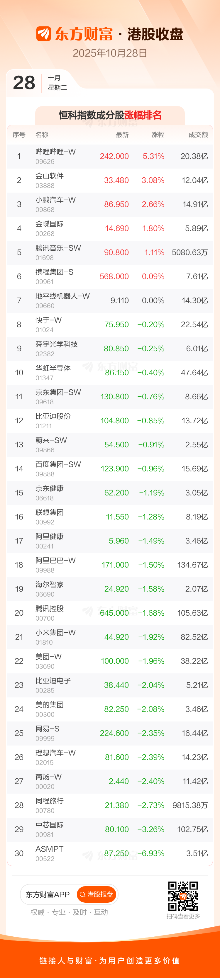 港股10月28日收盘走低,恒生指数收报26346.14点,跌87.56点,跌幅0.33%;恒生科技指数收报6093.44点,跌77.64点,跌幅1.26%。恒生指数成分股中汇丰控股、信义光能、友邦保险涨幅居前,紫金矿业、周大福、李宁跌幅靠前。恒生科技指数成分股中哔哩哔哩-W、金山软件、小鹏汽车-W涨幅居前,ASMPT、中芯国际、同程旅行跌幅靠前。