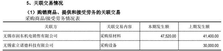 (截自2021年年报) 除了招股书与年报对客户、供应商的购销数据披露存在疑点外,威易发对于关联交易的披露也存在招股书与年报数据“打架”情况。 招股书显示,2021年威易发曾向关联方无锡市润东机电销售有限公司(以下简称“润东机电”)采购磨削液,金额为42,053.10元;但在2021年年报中,该采购金额变为47,520.00元。