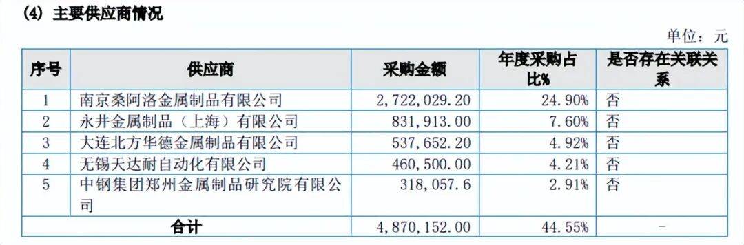 (截自首轮问询回复文件) 除了客户销售数据存在出入外,威易发对供应商的信息披露方面也存在疑点。 根据招股书,2021年前五大供应商依次为:南京桑阿洛金属制品有限公司(以下简称“桑阿洛”)、卡彭特(上海)贸易有限公司、永井金属制品(上海)有限公司(以下简称“永井金属”)、上海迅志图像科技有限公司和中钢集团郑州精密新材料有限公司,采购金额分别为262.57万元、109.34万元、73.62万元、70.28万元和62.79万元。 而在当年年报中,前五大供应商名单变为:桑阿洛、永井金属、大连北方华德金属制品有限公司、无锡天达耐自动化有限公司和中钢集团郑州金属制品研究院有限公司。不仅供应商名单出现变动,采购金额也有所不同。年报中显示对桑阿洛采购金额为272.20万元,对永井金属采购额为83.19万元,相比招股书中披露的合并口径金额还要多。