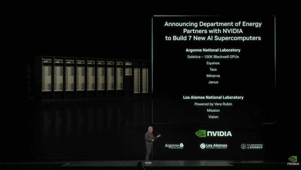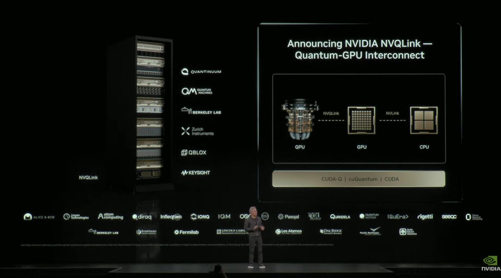 英伟达联手诺基亚布局6G网络 作为官宣的第一个合作协议,黄仁勋宣布与诺基亚达成合作协议,除了10亿美元股权投资外,两家公司还将合作推出面向6G的电信计算平台NVIDIA ARC(Aerial RAN Computer),捕捉AI-RAN市场的机遇。NVIDIA Arc是运行在CUDA-X之上的无线通信系统。 ![]() 英伟达介绍称,目前“AI流量”正处于爆发性增长的状态,例如ChatGPT每周8亿活跃用户中,几乎有50%的人通过移动设备访问该AI。借助AI-RAN系统,移动运营商可以提升性能和效率,增强AI应用的网络体验,并用同样的设施提供6G服务,为无人机、汽车、机器人以及AI眼镜提供网络连接。 在会后的新闻稿中,英伟达也宣布与T-Mobile、思科等合作伙伴打造美国首个面向6G的AI原生无线堆栈,并推出推进下一代无线技术的新应用。 NVQLink连接量子计算与GPU系统 英伟达同时展示了基于CUDAQ核心构建的NVQLink,用于连接传统GPU和量子计算机,共同加速量子计算。目前的量子计算对环境噪声高度敏感,且可用性有限。因此需要基于GPU的超级计算机承担起量子处理器的部分负载,支持量子纠错所需的控制算法。 ![]() 英伟达称,NVQLink技术已获得17家量子处理器制造商和5家控制器制造商的支持,包括Alice & Bob、Atom Computing、IonQ、IQM Quantum Computers、Quantinuum、Rigetti等公司。美国能源部领导的9个国家实验室将使用NVQLink推动量子计算突破,包括布鲁克海文国家实验室、费米实验室、洛斯阿拉莫斯国家实验室(LANL)等。 英伟达表示,开发人员可以通过CUDA-Q软件平台访问NVQLink,创建和测试无缝调用CPU、GPU和量子处理器的应用程序。 英伟达与甲骨文打造美能源部最大AI超算 黄仁勋还宣布与美国能源部达成协议,将再建设7台超级计算机。这些超算将使用Blackwell和下一代Vera Rubin架构芯片,分别配置在阿贡国家实验室和洛斯阿拉莫斯国家实验室。 ![]() 英伟达宣布与甲骨文合作,为美国能源部建造该部门最大的AI超级计算机Solstice系统,该系统将创纪录地配备10万块英伟达Blackwell GPU。另一套名为Equinox的系统将包含1万个Blackwell GPU,预计于2026年上半年投入使用。 两套系统均通过英伟达网络互联,总计提供2200 exaflops的AI性能。这些超级计算机将使科学家和研究人员能够使用英伟达Megatron-Core库开发和训练新的前沿模型和AI推理模型,并使用TensorRT推理软件堆栈进行扩展。 能源部长Chris Wright表示:"维护美国在高性能计算领域的领导地位,需要我们搭建通向下一个计算时代的桥梁:加速量子超级计算。我们国家实验室、初创公司和英伟达等行业合作伙伴之间的深度合作对这一使命至关重要。" BlueField-4推动AI工厂基础设施升级 黄仁勋认为,代理式AI不再只是一种工具,而是人们所有工作的助手。AI带来的“机会不胜枚举”。英伟达的计划是建造专用于AI的工厂,里面堆满芯片。 英伟达宣布,推出支持AI工厂操作系统的处理器Bluefield-4。 英伟达发布BlueField-4数据处理单元,支持800Gb/s吞吐量,为千兆级AI基础设施提供突破性加速。该平台结合英伟达Grace CPU和ConnectX-9网络技术,计算能力是BlueField-3的6倍,可支持规模扩大4倍的AI工厂。 BlueField-4专为新一类AI存储平台设计,为AI数据管道的高效数据处理和大规模突破性性能奠定基础。该平台支持多租户网络、快速数据访问、AI运行时安全和云弹性,原生支持英伟达DOCA微服务。 ![]() 英伟达与CrowdStrike合作AI网络安全开发 黄仁勋称,英伟达将与网络安全公司CrowdStrike在AI网络安全模型方面进行合作。 英伟达宣布与CrowdStrike建立战略合作,在CrowdStrike Falcon XDR平台上提供英伟达AI计算服务。该合作将Falcon平台数据与英伟达GPU优化的AI管道和软件(包括新的英伟达NIM微服务)相结合,使客户能够创建定制化安全生成式AI模型。 CrowdStrike将利用英伟达加速计算、英伟达Morpheus和NIM微服务,将定制LLM驱动的应用程序引入企业。结合Falcon平台的独特上下文数据,客户将能够解决特定领域的新用例,包括处理PB级日志以改进威胁搜寻、检测供应链攻击、识别用户行为异常,以及主动防御新兴漏洞。 ![]() 英伟达新自动驾驶开发平台助Uber部署Robotaxi车队 黄仁勋介绍,英伟达的端对端自动驾驶平台DRIVE Hyperion已准备好推出提供Robotaxi服务的汽车。包括Stellantis、Lucid 和梅赛德斯-奔驰在内的全球汽车制造商将利用英伟达的新技术平台DRIVE AGX Hyperion 10架构加速开发自动驾驶技术。 ![]() 英伟达宣布与Uber建立合作关系,使用新一代英伟达DRIVE AGX Hyperion 10自动驾驶开发平台和DRIVE AV软件,扩展全球最大的L4级移动网络。英伟达将支持Uber,从2027年开始逐步将其全球自动驾驶车队规模扩大至10万辆。 ![]() DRIVE AGX Hyperion 10是一个参考级生产计算机和传感器架构,使任何车辆都能达到L4级准备状态。该平台使汽车制造商能够构建配备经过验证的硬件和传感器的汽车、卡车和货车,可以托管任何兼容的自动驾驶软件。 黄仁勋表示:"无人驾驶出租车标志着全球交通转型的开始——使交通更安全、更清洁、更高效。我们与Uber共同为整个行业创建了一个框架,以大规模部署自动驾驶车队。" Uber CEO Dara Khosrowshahi表示:"英伟达是AI时代的支柱,现在正充分利用这一创新,以巨大规模释放L4自动驾驶能力。" 英伟达与Palantir打造运营AI技术栈 Lowe's率先应用供应链优化方案 英伟达与Palantir的合作核心是将英伟达的GPU加速计算、开源模型和数据处理能力整合到Palantir AI平台(AIP)