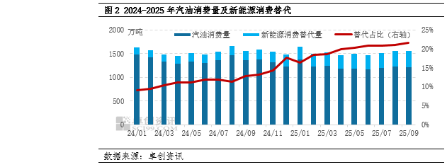 新能源对汽油消费替代占比21.7% 9月随着暑期及开学季结束,居民远距离驾车出行频率降低,恢复日常通勤为主,且高温天气逐渐减少,车用空调刚需用油减弱,汽油终端需求边际下滑,仅月底受即将到来的双节支撑终端消耗速率稍有加快。因此9月汽油消费量同环比均有明显下滑。根据卓创资讯数据模型显示,9月国内汽油消费量在1218.48万吨,环比下降0.9%,同比下降10.5%。在不考虑报废率的前提下,当前国内新能源汽车保有量或达到4048万辆左右,考虑纯电、插混汽车对汽油不同的替代作用,根据卓创资讯数据模型显示,2025年9月中国新能源汽车替代汽油量在338万吨左右,汽油替代占比21.7%,同比提升近9个百分点。但考虑目前市场新能源车辆在网约车、出租车等方面应用较多,对汽油实际替代占比或偏高。