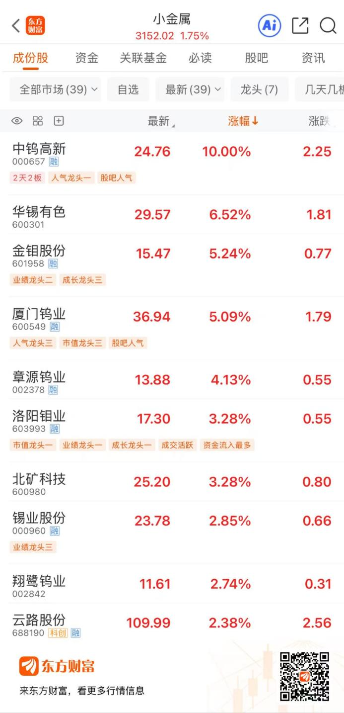 10月29日,A股小金属板块集体走强,钨方向领涨。截至发稿,中钨高新涨停,股价已2连板;厦门钨业涨超5%,股价创历史新高;章源钨业涨超4%,股价已8连阳;翔鹭钨业涨超2%,股价同样报8连阳。 ![]() 市场人士指出,钨精矿价格已回到历史高位。今年以来钨价格持续上涨,一方面受供给收缩、需求增长的影响。另一方面,持有者在强烈的看涨情绪下不愿出售,加剧了市场供应紧张和价格坚挺。 据中钨在线,钨市场持续强劲,上游原材料供应紧张,中游冶炼产品在成本压力的推动下创下新高。截至10月28日,65%黑钨矿精矿价格报28.8万元/吨,较年初上涨101.4%。65%白钨矿精矿价格报28.7万元/吨,较年初上涨102.1%。 ![]() 数据来源:中钨在线 在行业供需和成本的推动下,仲钨酸铵(APT)的价格创下新纪录。国内APT价格报42.5万元/吨,较年初上涨101.4%。欧洲APT价格报610-685美元/吨(38.4万-43.1万元人民币/吨),较年初上涨96.2%。 从供给端来看,为保护和合理开发优势矿产资源,按照保护性开采特定矿种管理相关规定,2025年国家继续对钨矿实行开采总量控制。据自然资源部和工信部数据,2025年全国钨精矿(三氧化钨含量65%)第一批开采总量控制指标5.8万吨,较2024年同期减少4000吨,同比下降6.45%。 需求方面,钨作为战略资源属性价值提升,需求持续增长。据安泰科数据,2025年1月至6月,中国钨消费合计3.59万金属吨,同比增长2.1%,其中原钨消费3.04万金属吨,同比增长2.5%。今年以来,下游主要应用行业中挖掘机、金属切削机床、汽车、光伏等产量明显增长,钨消费随之提升。 国信证券研报认为,国内钨价因需求增长、矿山安全生产以及环保督察等因素导致矿端供需紧张,而此前可用库存已被消耗。哈萨克斯坦巴库塔钨矿具备潜在增量,但产能释放仍需时间,短期内供需缺口或加剧。叠加出口管制力度加大,钨作为战略金属地位提升,包括钨在内的相关战略小金属的价格或继续上行。 A股布局钨生产的上市公司共有7家,今年业绩和股价均大幅增长。除了证券简称中带“钨”的中钨高新、厦门钨业、章源钨业和翔鹭钨业这4股外,洛阳钼业、广晟有色和湖南黄金这三股也有钨相关业务。 公开资料显示,洛阳钼业是全球领先的钼、钨生产商,于中国境内主要运营三道庄钼钨矿区和合营企业所属的上房沟钼铁矿区。湖南黄金长期专注于黄金、锑和钨三种金属的矿山开采和深加工,广晟有色形成了稀土、钨、铜硫及贸易等多元板块协同发展的格局。 ![]()