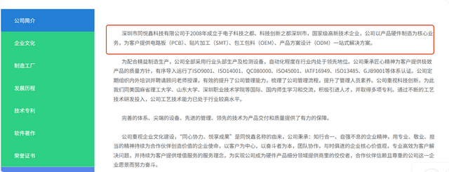 (截图源自企查查) 再来看深圳同悦鑫官网信息,该公司核心业务涵盖电路板(PCB)、贴片加工(SMT)、包工包料(OEM)及产品方案设计(ODM)等一站式硬件制造服务,(集团)在深圳、江西和江苏设有三家工厂,总厂房面积超过4万平方米,员工近千人。综合来讲,具备一定经营规模的深圳同悦鑫主营PCB制造,并强调一站式硬件制造服务,这与嘉立创业务存在一定重叠。