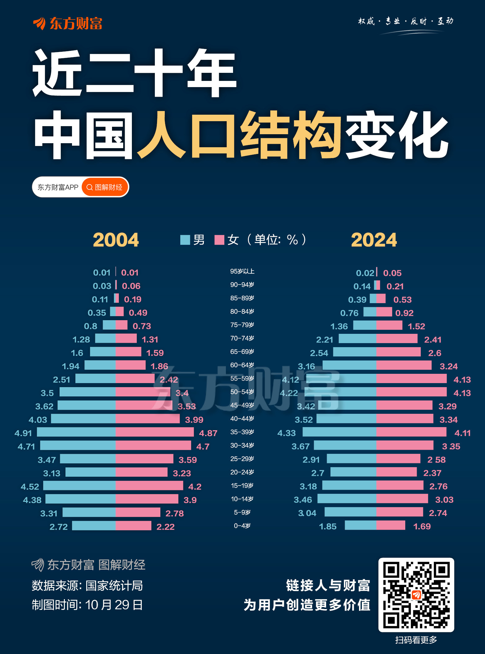 ![]() 10月29日是农历九月初九,月、日皆逢九,两个最大的阳数重叠一起,故曰“重阳”节。 “九九”与“久久”谐音,寓意老人健康长寿。从1989年开始,我国把每年的重阳节定为“老人节”“敬老节”,成为一个提醒人们“记得看望父母”“关心老年群体”的社会契机。 数据显示,长寿趋势和少子化使得中国老龄化持续加深,老年人口不断增加。据国家统计局,2024年年末,全国人口140828万人,从年龄构成看,60岁及以上人口31031万人,占全国人口的22.0%,其中65岁及以上人口22023万人,占全国人口的15.6%。 而在2004年年末,全国人口129988万人,60岁以上人口约14300万人,占全国人口的10.97%,其中65岁及以上人口9857万人,占全国人口的7.6%。二十年的时间里,60岁以上的人口在全国人口中的占比已然翻倍。 横向来看,据联合国发布的《世界人口展望2024》,世界前二十的人口大国中,中国的人口年龄中位数为39.6岁,位列其中第五。日本、德国、泰国和俄罗斯位列前四,年龄中位数分别为49.4岁、45.3岁、40.1岁、39.9岁;美国第六,年龄中位数为38.3岁。