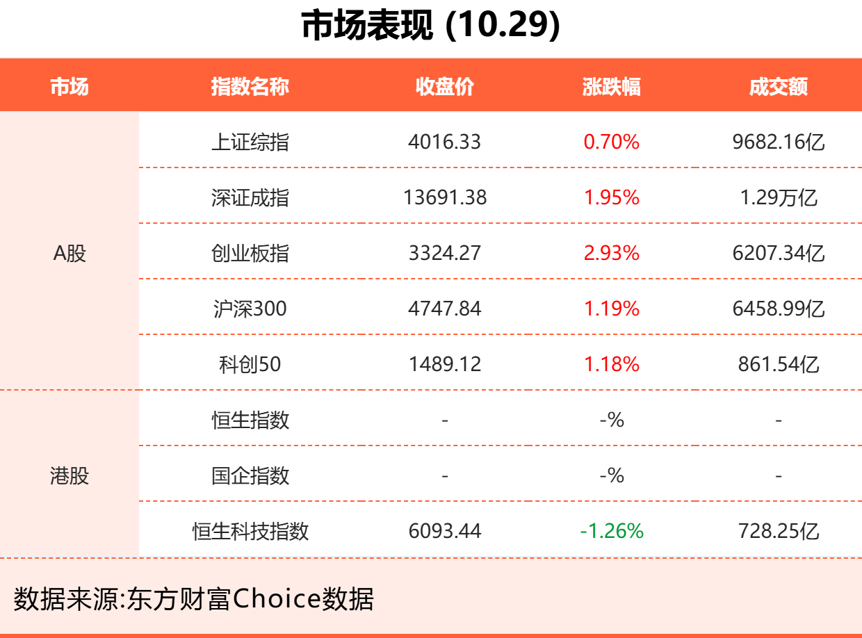 主题机会光伏: 10月28日发布的《中共中央关于制定国民经济和社会发展第十五个五年规划的建议》(“十五五”规划建议)提出,持续提高新能源供给比重,推进化石能源安全可靠有序替代,着力构建新型电力系统,建设能源强国。据国家发展改革委主任郑栅洁介绍,到“十五五”末,新增用电需求绝大部分由新增清洁能源发电量满足。 周三光伏多只龙头股表现强势,阿特斯20CM涨停,阳光电源涨超15%,隆基绿能、通威股份、晶澳科技等涨停,双良节能、TCL中环、大全能源等涨幅居前。数据显示,截至10月29日收盘,双良节能、横店东磁、阳光电源、易成新能、华民股份、东方日升、捷佳伟创、联泓新科、锦浪科技等多只个股2025年三季报净利润增长率在29%至59%之间不等。 海南自贸区: 海南封关在即,政策利好逐渐释放。今年12月18日,海南自由贸易港将正式启动全岛封关运作,实现更高水平对外开放,实施更加优惠的货物“零关税”政策、更加宽松的贸易管理措施、更加便利的通行措施和更加高效精准的监管模式,产业发展空间越来越广阔,对外合作网络越来越开放。 截至10月29日收盘,海南自贸区概念上涨4.35%,板块内,23股上涨,海南发展、海汽集团、海德股份等涨停,康芝药业、金盘科技、海南机场等涨幅居前,分别上涨15.95%、11.19%、7.62%。跌幅居前的有ST华闻、*ST椰岛、ST葫芦娃等,分别下跌2.61%、0.75%、0.66%。 资金面上看,今日海南自贸区概念板块获主力资金净流入17.45亿元,其中,20股获主力资金净流入,6股主力资金净流入超亿元,净流入资金居首的是海南机场,今日主力资金净流入4.31亿元,净流入资金居前的还有康芝药业、海航控股、海南发展等,主力资金分别净流入2.08亿元、1.99亿元、1.88亿元。 公司新闻新易盛:第三季度营收为60.68亿元,同比增长152.53%;净利润为23.85亿元,同比增长205.38%。前三季度营收为165.05亿元,同比增长221.70%;净利润为63.27亿元,同比增长284.37%。 工业富联:第三季度实现营业收入2431.72亿元,同比增长42.81%;归属于上市公司股东的净利润为103.73亿元,同比增长62.04%。前三季度累计实现营业收入6039.31亿元,同比增长38.40%;归属于上市公司股东的净利润为224.87亿元,同比增长48.52%。 天孚通信:第三季度实现营业收入14.63亿元,同比增长74.37%;归属于上市公司股东的净利润5.66亿元,同比增长75.68%。前三季度实现营业收入39.18亿元,同比增长63.63%;归属于上市公司股东的净利润14.65亿元,同比增长50.07%。 江波龙:第三季度实现营业收入65.39亿元,同比增长54.60%;归属于上市公司股东的净利润6.98亿元,同比扭亏。前三季度实现营业收入167.34亿元,同比增长26.12%;归属于上市公司股东的净利润7.13亿元,同比增长27.95%。 多氟多:近期受益于储能市场强劲的增长,公司大圆柱电池的储能客户订单激增,公司正按照订单情况,产线满负荷运行以满足市场需求。 淳中科技:前三季度营业收入为1.94亿元,同比下降40.69%;归属于上市公司股东的净利润亏损2923.85万元。第三季度营业收入为6482.24万元,同比下降30.22%;归属于上市公司股东的净利润为1078.01万元,同比下降12.16%。报告期内,受到专业视听及人工智能业务下滑影响,公司营业收入同比下降。 中金公司:公司发布2025年第三季度报告,第三季度实现营业收入79.33亿元,同比增长74.78%;归属于母公司股东的净利润22.36亿元,同比增长254.93%。前三季度实现营业收入207.61亿元,同比增长54.36%;归属于母公司股东的净利润65.67亿元,同比增长129.75%。 上纬新材:上海智元恒岳科技合伙企业(有限合伙)(简称“智元恒岳”)要约收购公司股份期限届满。本次要约收购完成后,智元恒岳持有公司58.6232%股份,智元恒岳及其一致行动人共计持有公司63.6232%股份。公司股票自2025年10月30日(星期四)开市起复牌。 宏和科技:第三季度实现营业收入3.02亿元,同比增长43.10%;归属于上市公司股东的净利润为5143.33万元,同比增长644.41%。前三季度实现营业收入8.52亿元,同比增长37.76%;归属于上市公司股东的净利润为1.39亿元,同比增长1696.45%。 贵州茅台:第三季度营收为390.64亿元,同比增长0.56%;净利润为192.24亿元,同比增长0.48%。前三季度营收为1284.54亿元,同比增长6.36%;净利润为646.27亿元,同比增长6.25%。 东尼电子:公司于2025年10月29日收到中国证券监督管理委员会浙江监管局下发的《行政处罚事先告知书》。公司股票将于2025年10月30日停牌1天,2025年10月31日起实施其他风险警示,股票价格的日涨跌幅限制为5%。 华宏科技:第三季度营收为23.02亿元,同比增长70.39%;净利润为1.17亿元,同比增长23211.89%。前三季度营收为54.61亿元,同比增长34.94%;净利润为1.97亿元,同比增长7110.70%。 央视新闻联播 经中美双方商定,国家主席习近平将于当地时间10月30日在韩国釜山同美国总统特朗普举行会晤,就中美关系和双方共同关心的问题交换意见。 中央层面整治形式主义为基层减负专项工作机制会议10月28日在京召开。中共中央政治局常委、中央书记处书记蔡奇出席会议并讲话。他强调,要认真学习贯彻党的二十届四中全会精神和习近平总书记重要指示精神,锲而不舍贯彻中央八项规定精神,持续深化整治形式主义为基层减负,常态化长效化推进作风建设,为确保“十四五”圆满收官、“十五五”良好开局提供坚强作风保证。 今天(10月29日)是重阳节,尊老敬老是中华民族传统美德,“十四五”以来,我国围绕老年友