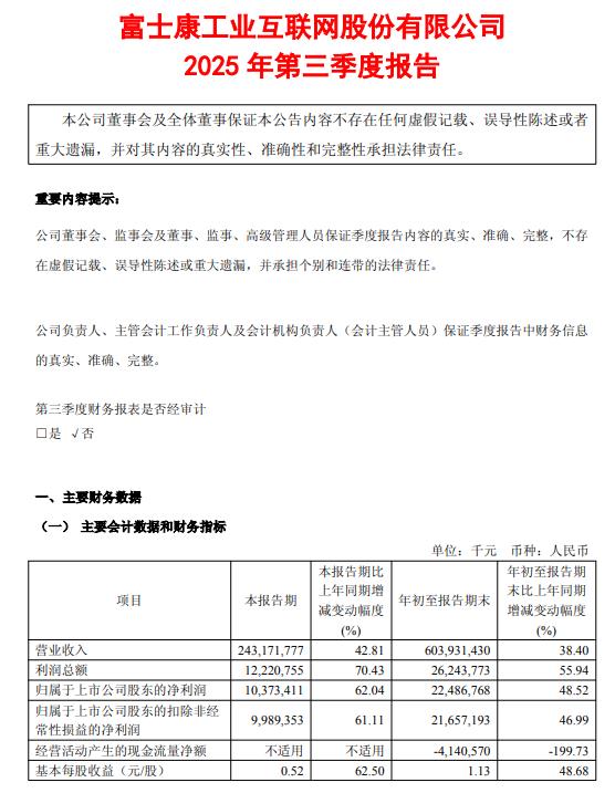 10月29日,工业富联(601138.SH)公告称,公司发布2025年第三季度报告,第三季度实现营业收入2431.72亿元,同比增长42.81%;归属于上市公司股东的净利润为103.73亿元,同比增长62.04%。前三季度累计实现营业收入6039.31亿元,同比增长38.40%;归属于上市公司股东的净利润为224.87亿元,同比增长48.52%。业绩增长主要得益于AI服务器市场持续扩张,超大规模数据中心用AI机柜产品规模化交付,以及云服务商客户需求强劲,推动云计算业务快速增长,其中AI服务器、交换机等高增长产品表现突出。