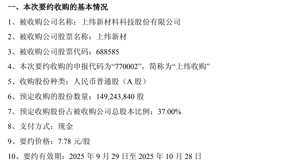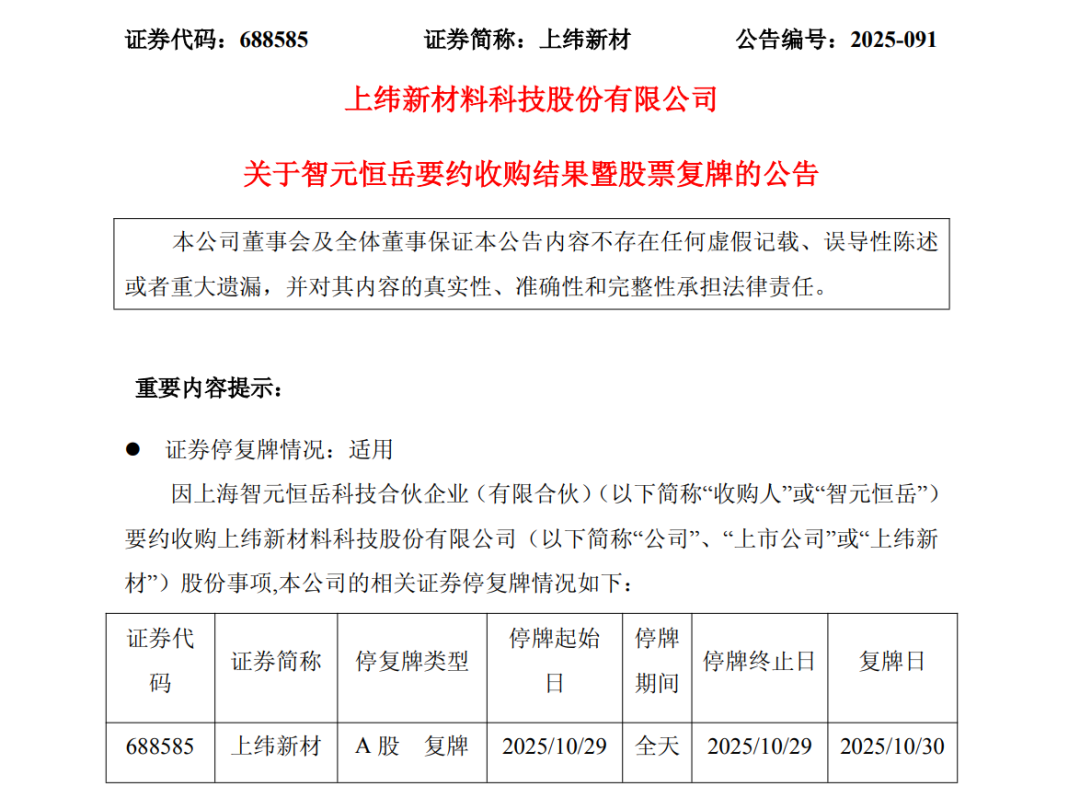 【导读】要约收购期限届满,上纬新材股票复牌 “大牛股”上纬新材要约收购事项再传新消息。 10月29日,上纬新材发布公告称,上海智元恒岳科技合伙企业(有限合伙)(以下简称智元恒岳)要约收购公司股份期限届满。 ![]() 本次要约收购期限内,预受要约的股东账户总数为22户,预受要约股份总数为1.36亿股,占上市公司股份总数的33.63%,要约收购价格为7.78元/股。收购人智元恒岳将按照要约收购约定的条件购买上述股份,过户手续根据相关规定办理。 ![]() 本次要约收购完成后,智元恒岳持有公司58.62%股份,智元恒岳及其一致行动人共计持有公司63.62%股份。 根据公告,收购人智元恒岳系智元创新(上海)科技有限公司及核心管理团队共同出资设立的持股平台。 上纬新材表示,收购人及股东认同上市公司长期价值和A股资本市场对科技创新和产业创新的服务能力,拟通过本次要约收购进一步增强对上市公司的控制权。本次要约收购完成后,收购人将以有利于上市公司可持续发展、有利于上市公司股东特别是中小股东权益为出发点,进一步发挥科技创新企业整合产业链资源、突破技术瓶颈和加速产业升级的优势,完善上市公司的经营和管理,促进上市公司长期、健康发展。 根据公告,本次要约收购类型为主动要约,并非履行法定要约收购义务。本次要约收购不以终止上纬新材的上市地位为目的。 上纬新材股票自2025年10月30日(星期四)开市起复牌。