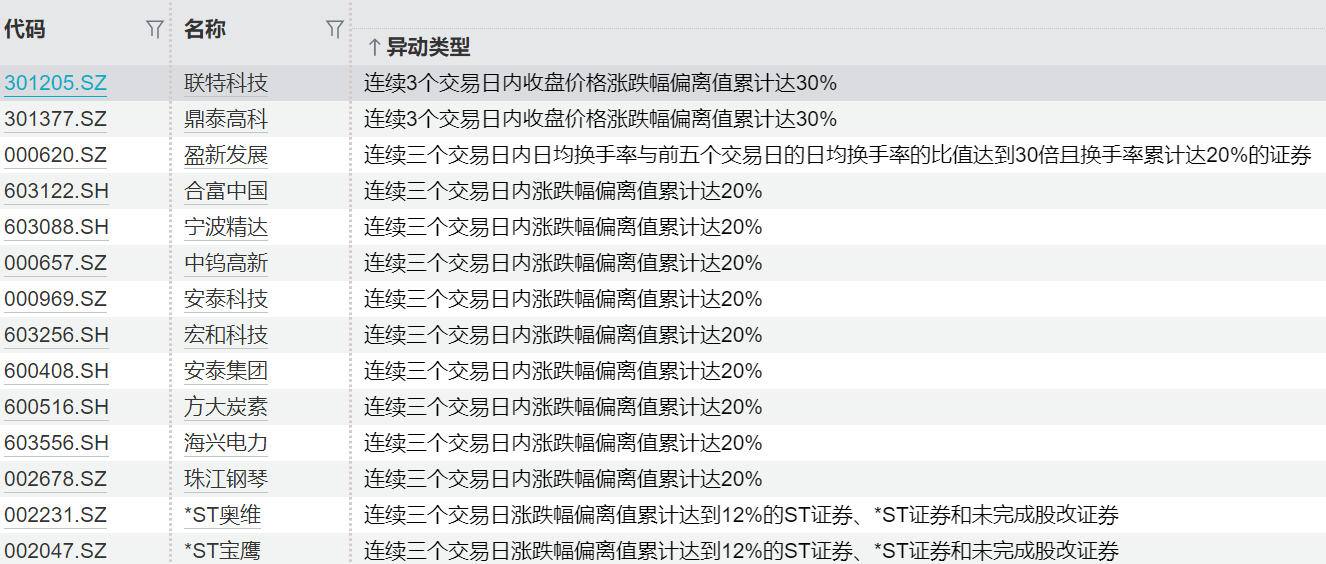联特科技、鼎泰高科等连续3个交易日内收盘价格涨跌幅偏离值累计达30%。