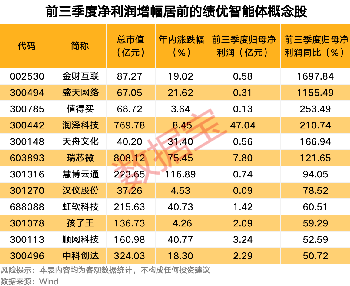 智能体商业落地进程加速 多只智能体概念股业绩大幅增长 专业金融数据,下一代智能终端 目前,各大厂、创业公司、SaaS厂商正在加速推动智能体的商业落地进程,各大场景的AI智能体厂商也在2025年实现了初步的收入积累,中金公司认为,后续的规模化放量阶段也在渐行渐近。各类AI智能体框架与平台的涌现在技术生态层面为AI智能体产品和技术的升级提供支持,助力产业整体的持续加速迭代。 据证券时报·数据宝统计,智能体概念股有80余只。10月以来,12只概念股获得机构调研,其中科大讯飞、焦点科技、博彦科技的机构调研家数居前。 从业绩表现来看,目前70余只智能体概念股发布前三季度业绩报告,润泽科技的净利润规模最大。金山办公、瑞芯微、协创数据、网宿科技、萤石网络的净利润规模居前。金财互联、盛天网络、值得买、润泽科技、天舟文化、瑞芯微的前三季度净利润增幅均超100%,业绩实现翻倍。 ![]() (文章来源:人民财讯) |