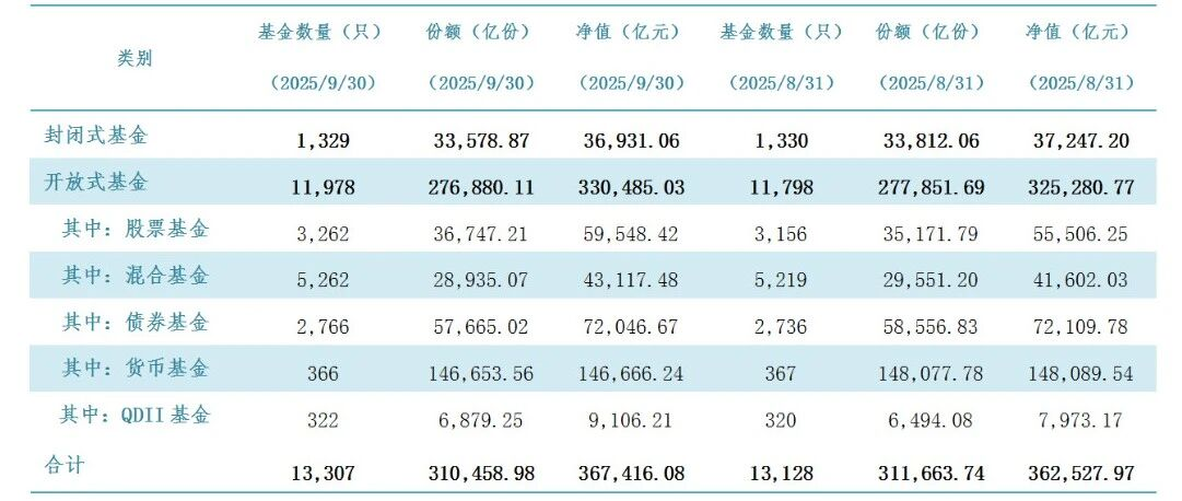 财联社10月30日讯(记者李迪)自今年4月底以来,我国公募基金总规模已连续六个月创下历史新高。 中基协最新发布的公募基金市场数据显示,截至2025年9月底,我国公募基金总规模为36.74万亿元,再创新高。此外,我国公募基金总规模在今年4月底、5月底、6月底、7月底、8月底均创下历史新高。 分类型来看,今年9月股票基金规模增长超4000亿元,混合基金规模增长超1500亿元,QDII基金规模增长超1100亿元。 而在利率下行、债市震荡、股市吸金等因素的影响下,货币基金的规模在9月下降超1400亿元,债券基金规模也微降63亿元。 公募总规模达36.74万亿,年内第六次创历史新高 中基协最新发布的公募基金市场数据显示,截至2025年9月底,我国境内公募基金管理机构共165家,其中基金管理公司150家,取得公募资格的资产管理机构15家。 以上机构管理的公募基金资产净值合计36.74万亿元,与8月底相比增长4888.11亿元。这也是我国公募基金总规模在今年以来第六次创下历史新高。 ![]() 今年年初,市场震荡加剧,我国公募基金总规模曾短暂下行。但自4月以来,公募总规模持续增长,多次实现历史性突破。 今年4月底,我国公募基金总规模达到33.12万亿元,年内第一次创下历史新高; 今年5月底,我国公募基金总规模继续增长至33.74万亿元,年内第二次创下历史新高; 今年6月底,我国公募基金总规模达到34.39万亿元,年内第三次创下历史新高; 今年7月底,我国公募基金总规模达35.08万亿元,年内第四次创下历史新高; 今年8月底,我国公募基金总规模首次突破36万亿元,年内第五次创下历史新高。 如今公募总规模在9月底再创新高,这意味着我国公募基金总规模已连续六个月实现新高突破。 股基规模猛增4000亿,混合基规模增长1500亿 分基金类型来看,股票基金和混合型基金为公募基金在今年9月的规模增长做出重要贡献。 股票型基金方面,资金流入和新产品发行推动其总份额实现显著增长。9月底,该类基金的总份额为3.67万亿份,与8月底的3.52万亿份相比增长1575亿份。 规模方面,股票型基金9月底的总规模达到5.95万亿元,与8月底的5.55万亿元增长4042.17亿元。 而混合型基金却未能实现规模份额双增。9月底,该类基金的总份额为2.89万亿份,与8月底的2.96万亿份相比小幅下降616.13亿份。 而受益于股市上行,混合型基金的规模却实现增长。9月底这类产品的总规模达到4.31万亿元,与8月底的4.16万亿元相比增长1515.45亿元。 业内人士指出,股市上行再加上ETF热度持续,推动股票型基金份额规模双增。而混合型基金中包含主动管理型产品和偏债混合型基金,因而份额增长压力较大。 具体来看,随着市场回暖,许多主动管理型产品的持有人逐步回本,一些持有人在回本后选择赎回,导致产品份额下降;而偏债混合型基金方面,由于股债“跷跷板”效应导致债市震荡加剧,一些偏债混合型基金也在面临大额赎回的挑战。 除股票基金和混合型基金外,QDII基金在9月也实现规模增长。9月底,QDII基金总规模达9106.21亿元,与8月底的7973.17亿元相比增长1133.04亿元。 货基规模下降超1400亿,债基规模微降63亿 股市回暖带动股基和混合基实现规模增长,而固收类产品这边则是另一番景象。 货币基金的9月底总份额为14.67万亿份,与8月底的14.81万亿份相比下降1424亿份;9月底总规模为14.67万亿元,与8月底的14.81万亿元相比下降1423亿元。 收益率下行是货币基金规模下降的重要原因之一。同花顺数据显示,今年9月底已有70余只货币基金的七日年化收益率跌破1%。过低的收益使得部分投资者选择撤离货币基金,转而投向其他更具收益潜力的产品,导致货币基金规模下降。 债券基金在9月也出现份额规模双降。9月底,债券基金总份额为5.77万亿份,与8月底的5.86万亿份相比下降891.81亿份。 而债券基金总规模的下降幅度则很小,9月底总规模为7.20万亿元,与8月底相比仅下降63.11亿元。 业内人士指出,受债市震荡影响,部分债券基金面临赎回压力,导致其份额有所下降。不过,由于债券基金中的一级债基、二级债基与可转债基金在股市上行的背景下实现净值增长,因而债基的规模下降幅度较小。 |
