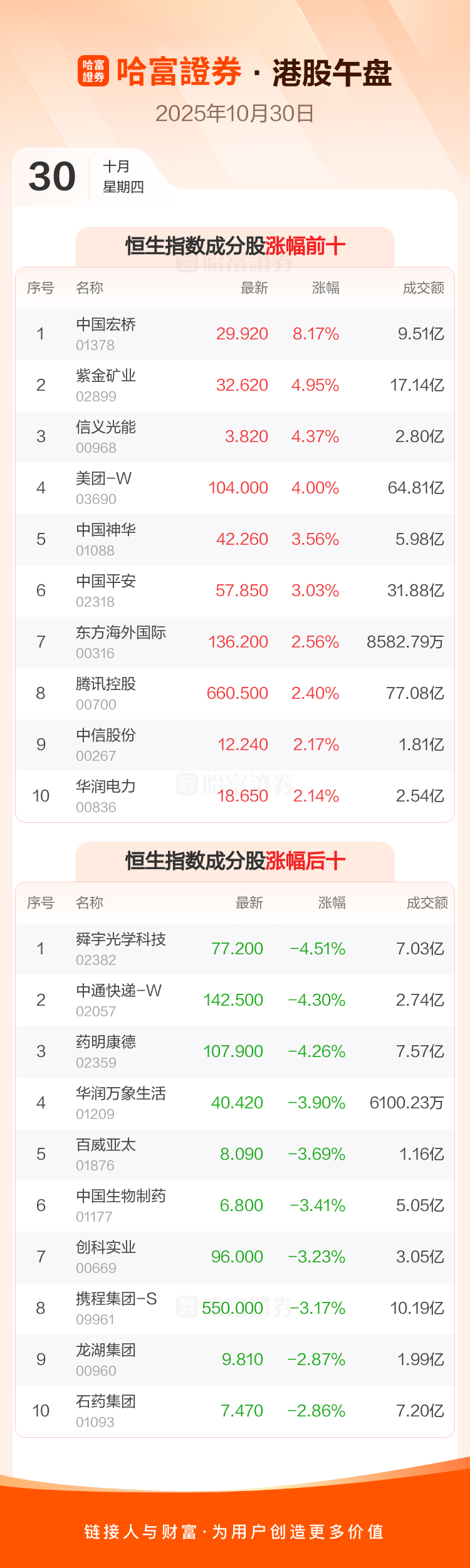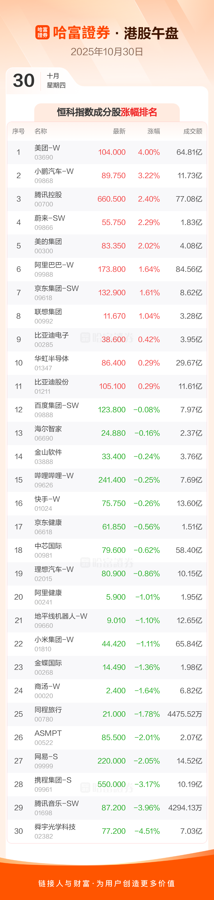 港股10月30日午盘走高,恒生指数收报26488.42点,涨142.28点,涨幅0.54%;恒生科技指数收报6112.09点,涨18.65点,涨幅0.31%。恒生指数成分股中中国宏桥、紫金矿业、信义光能涨幅居前,舜宇光学科技、中通快递-W、药明康德跌幅靠前。恒生科技指数成分股中美团-W、小鹏汽车-W、腾讯控股涨幅居前,舜宇光学科技、腾讯音乐-SW、携程集团-S跌幅靠前。