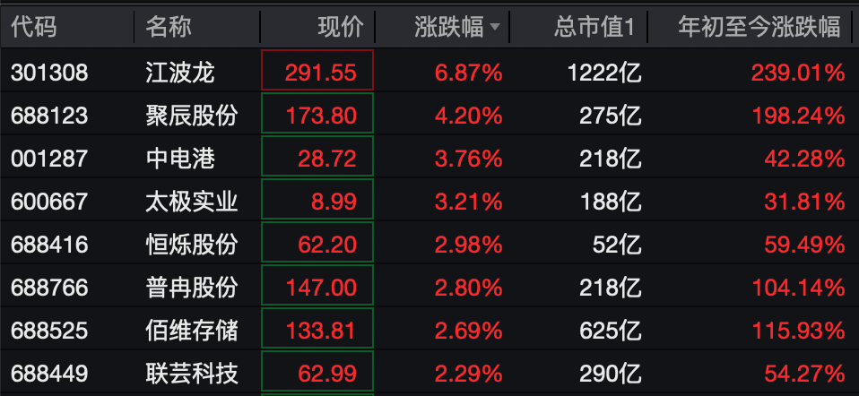 【导读】A股三大股指集体低开,港口航运、存储芯片走强;开盘1分钟,鹏辉能源录得20cm涨停 大家好,基金君和你一起关注今天早盘的市场行情。 10月30日,A股三大股指集体低开。 ![]() 截至记者发稿,沪深两市成交额突破5000亿元。 从板块看,港口航运、存储芯片板块领涨,通信设备、贵金属板块领跌。 鹏辉能源录得20cm涨停 10月30日,钠离子电池概念板块上涨,开盘1分钟,鹏辉能源录得20cm涨停。 欣旺达涨幅超11%,多氟多、派能科技、华阳股份等个股跟涨。 ![]() 港口航运板块拉升 10月30日早盘,港口航运板块拉升。 个股方面,招商轮船触及涨停,中远海能、华光源海涨超8%,招商南油、中远海特、凤凰航运跟涨。 ![]() 另外,中韩自贸区板块活跃。个股方面,朗姿股份涨停,华光源海、ST新华锦、青岛金王跟涨。 消息面上,中国与东盟签署自贸区3.0版升级议定书,全面拓展新兴领域互利合作,新增数字经济、绿色经济等5个领域,促进区域贸易便利化及包容发展。 同时,国家外汇管理局10月29日发布支持外贸稳定发展一揽子便利化政策,从推动便利化政策优化扩围、支持贸易新业态等创新业务健康发展、提升服务贸易企业资金使用效率三个方面推出9项政策措施,进一步便利市场经营主体办理跨境贸易业务。 存储芯片板块再度走强 存储器概念板块涨幅居前,多只相关个股高开。江波龙股价一度涨超11%,续创历史新高。 10月30日,江波龙披露三季报,营收与利润实现双高增。具体来看,公司2025年第三季度实现营收65.39亿元,同比增长54.6%;归母净利润达6.98亿元,同比暴增1994.42%,主要原因是销售增长、巴西PADIS税收优惠及公允价值变动收益大幅上升。 从前三季度业绩看,江波龙实现营收167.34亿元,同比增长26.12%;归母净利润为7.13亿元,同比增长27.95%;基本每股收益为1.71元,同比增长26.67%。 另外,聚辰股份、中电港、太极实业等涨幅居前。 ![]() 阳光电源股价突破200元 10月30日,阳光电源股价突破200元,日内涨超4%,总市值超4100亿元。 消息面上,阳光电源受益于储能需求持续增长,前三季度营收、净利同比高增。 先导智能昨日晚间也发布了2025年三季报。报告显示,公司前三季度实现营收104.39亿元,同比增长14.56%;归母净利润为11.86亿元,同比增长94.97%;扣非归母净利润为11.85亿元,同比增长101.35%;基本每股收益为0.76元。 黄金股明显回调 10月30日早盘,贵金属板块领跌,多只黄金股出现回调。 个股方面,晓程科技跌逾3%,中金黄金、招金黄金、山东黄金、四川黄金等相关个股纷纷下跌。 ![]() 国际金价持续大幅震荡。截至发稿,现货黄金报3950.92美元/盎司,日内涨0.54%。 (文章来源:中国基金报) |