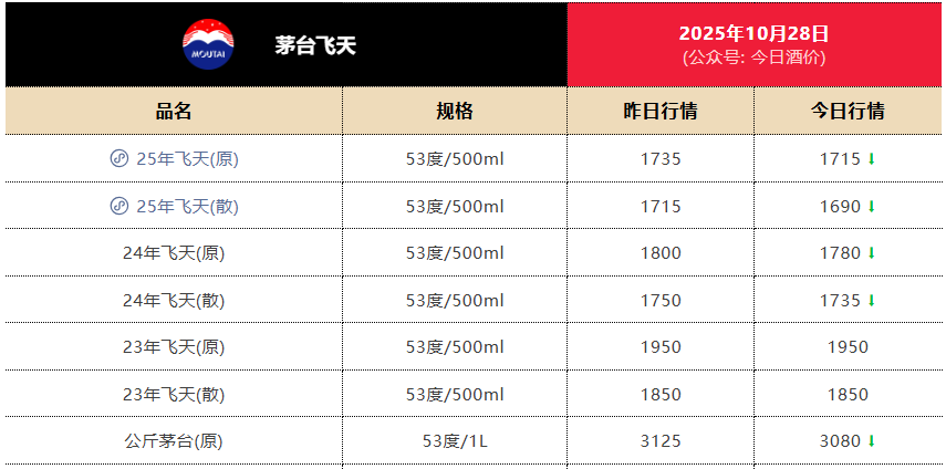 白酒行业深度调整之际,贵州茅台的三季报“成绩单”引起了市场的广泛关注。 10月29日晚间,贵州茅台披露2025年三季度报告,公司前三季度实现营业收入1284.54亿元,同比增长6.36%;归母净利润646.27亿元,同比增长6.25%。 从单季度表现来看,第三季度仍实现营收390.64亿元,同比增长0.56%;净利润192.24亿元,同比增长0.48%,勉强守住了正增长底线。 10月30日早盘,贵州茅台股价低开高走,截至发稿,贵州茅台股价报1432.89元/股,涨幅0.07%。 ![]() 净利润增速创十年新低 对比过往数据可以发现,贵州茅台2025年前三季度总营收和净利润均创历史新高,但增速均创下自2015年以来新低。尤其是第三季度0.48%的净利润增速,创下了自2014年以来的新低。 从贵州茅台披露的部分经营业绩数据来看,今年1至9月份茅台酒收入1105.14亿元,比2024年同期1011.26亿元有所增长,增幅约9.2%,这一大单品对贵州茅台前三季度业绩增长起到决定作用。不过,酱香系列酒方面收入录得178.84亿元,同比去年同期有所下降。 值得注意的是,飞天茅台批发价近期持续下探。第三方平台“今日酒价”披露的批发参考价显示,10月28日,飞天茅台批发价首次跌破1700元这一重要关口,创下历史新低。 ![]() 数据来源:今日酒价 10月29日,飞天茅台批发价继续下跌。据第三方平台“今日酒价”披露的批发参考价显示,25年飞天散瓶(53度/500ml)较前一日下跌10元,报1680元/瓶,再创新低;25年飞天原箱较前一日下跌15元,报1700元/瓶。 巨头企业三季报业绩分化 据东方财富Choice数据,截至10月29日,已有4272家上市公司披露了2025年三季报,占比近八成。总市值(证监会算法)超5000亿元的巨头企业共计26家,其中包括贵州茅台在内的14家已经披露了最新业绩情况,整体来看,业绩情况有所分化。 ![]() 已披露三季报的巨头中,寒武纪的增速最高,前三季度净利润同比增长321.49%;其次是紫金矿业,同比增长55.45%;工业富联紧随其后,同比增长48.52%。中国神华和中国石化净利润增速下滑,分别同比下降9.98、32.23%。 市值超5000亿元的巨头企业中,农业银行、工商银行、建设银行、中国石油、中国人寿、比亚迪、中芯国际、邮储银行、长江电力、交通银行、中际旭创等14家公司,截至10月29日尚未发布2025年三季报。
