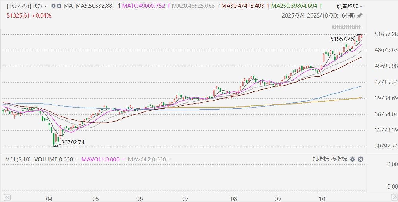 格隆汇10月30日|日经225指数盘中一度涨0.68%报51657.28点,再创历史新高;最终收涨0.04%报51325.61点,创收盘历史新高。日经225指数年内累涨28.65%。