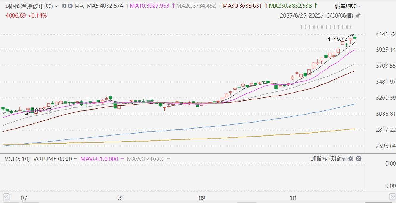 格隆汇10月30日|韩国综合指数盘中一度涨1.61%报4146.72点,再创历史新高;最终收涨0.14%报4086.89点,再创收盘历史新高;韩国综合指数年内累涨70.32%。