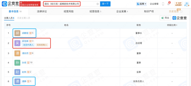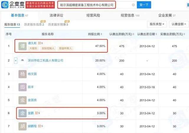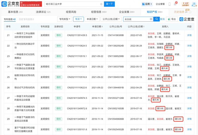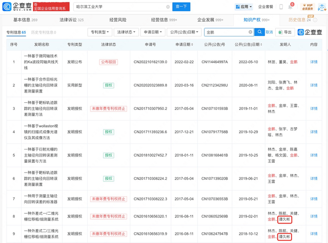 (图片截自企查查) 除股权上有联结外,“金鹏”、“谭久彬”和“吴剑威”这三个名字还存在共同研发专利的情况。搜索哈工大的专利列表可知,三个名字均是哈工大多项专利的发明人,其中“谭久彬”和“吴剑威”作为共同发明人参与研发的有效专利达数十项,“谭久彬”和“金鹏”也存在多项共同发明专利,不过都已失效。高校官网显示,“金鹏”、“吴剑威”与“谭久彬”三人都在哈工大仪器科学与工程学院任职。