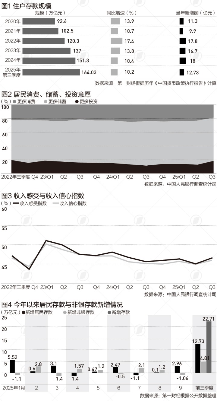央行调查:三季度倾向“更多投资”占比提升 为近两年新高 全新妙想投研助理,立即体验 中国人民银行按季度发布的“城镇储户问卷调查报告”被外界认为是居民消费、投资潜力的风向标。 《2025年第三季度城镇储户问卷调查报告》(下称《报告》)显示,倾向于“更多消费”的居民占19.2%,比上季低4.1个百分点;倾向于“更多储蓄”的居民占62.3%,比上季低1.5个百分点;倾向于“更多投资”的居民占18.5%,比上季高5.6个百分点。 第一财经梳理近两年的《报告》发现,倾向于“更多储蓄”的占比整体呈上升趋势,从2023年的第一季度的58%,上升到2025年第三季度的62.3%。这一趋势,与不断高企的居民存款规模形成相互印证。《2025年前三季度金融统计数据报告》显示,前三季度人民币存款增加22.71万亿元。其中,住户存款增加12.73万亿元。由此测算,截至2025年第三季度,住户存款规模已达164.03万亿元,同比增速10.2%。 不过,在今年第三季度,倾向“更多储蓄”的占比较上一个季度下降1.5个百分点的同时,较近两年的高点(2024年第三季度为64%)下降1.7个百分点。 今年第三季度倾向“更多消费”与“更多储蓄”的占比一共下降5.6个百分点。这也意味着,倾向“更多投资”的占比提升了5.6个百分点。 第一财经梳理近两年来的《报告》发现,倾向于“更多投资”的居民占18.5%,这一数据是2023年第二季度以来的最高值。 近几个月,随着资本市场回暖,居民存款“搬家”到股市,成为备受关注的话题。 ![]() 先是7月、8月居民存款连续两个月低于季节性增幅,同时非银存款(非银金融机构存款)相应增加。这一存款结构的变化,被解读为居民存款出现向股市等资本市场转移的趋势。不过,最新发布的9月金融数据又使这一趋势出现了波动。9月数据显示,住户存款与非银存款呈现“一增一减”。其中,住户存款新增2.96万亿元,同比多增7600亿元;非银存款减少1.06万亿元,同比少增1.97万亿元。业界对此评论称,居民存款“搬家”入市进程出现放缓迹象,居民资产再配置过程仍在延续。 今年三季度《报告》显示,居民偏爱的前五位投资方式依次为:“银行非保本理财”“基金信托产品”“股票”“债券”和“非消费型保险”,选择这五种投资方式的居民占比分别为36.0%、26.4%、17.2%、14.8%和11.1%。问及未来三个月准备增加支出的项目时,居民选择的前五位依次为:旅游(31.6%),教育(31.5%),医疗保健(26.1%),社交、文化和娱乐支出(21.9%),大额商品(18.7%)。 从金融数据以及《报告》看,居民部门对未来经济预期的谨慎态度仍较明显。 在解读“前三季度居民收入和消费支出”数据时,国家统计局住户调查司司长张毅称,下阶段,要扎实做好民生保障工作,继续稳定和扩大居民就业,促进居民收入持续稳定增长,不断增强居民消费能力和消费意愿。 近日公开的《中共中央关于制定国民经济和社会发展第十五个五年规划的建议》在大力提振消费方面提出,统筹促就业、增收入、稳预期,合理提高公共服务支出占财政支出比重,增强居民消费能力。 《报告》为中国人民银行按季对全国城镇储户进行的抽样调查,采用标准化的调查问卷和访谈形式,每年2、5、8、11月在全国同时进行。该调查在全国50个(大、中、小)调查城市中选定400个储蓄网点(包括各商业银行自办储蓄所和储蓄专柜)作为调查基点,在每个调查网点随机抽取50名储户为调查对象。 (文章来源:第一财经) |