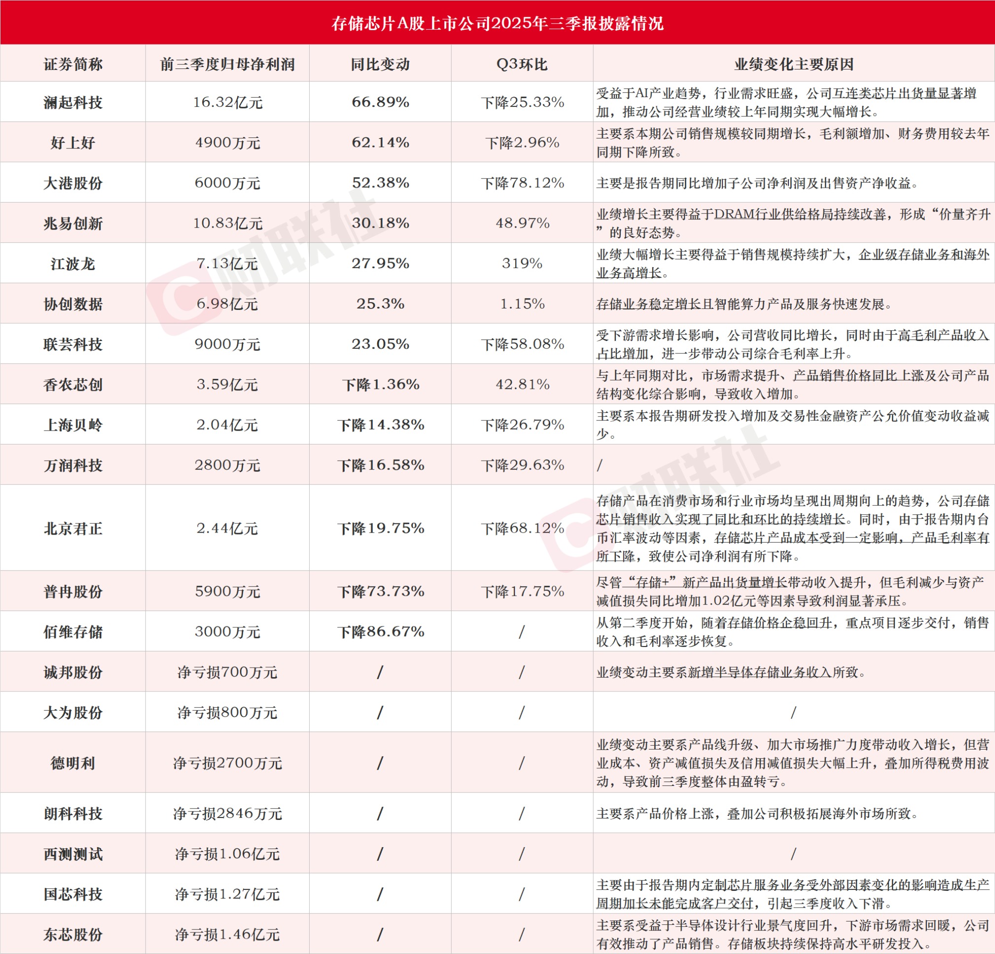 据财联社不完全统计,截至发稿,包括澜起科技、好上好、大港股份、兆易创新、江波龙、协创数据、联芸科技、香农芯创、上海贝岭、万润科技、北京君正、普冉股份、佰维存储、诚邦股份、大为股份、德明利、朗科科技、西测测试、国芯科技、东芯股份在内的多家存储芯片上市公司披露三季报。其中,澜起科技前三季度净利润同比增长67%,江波龙Q3净利环比增长319%。