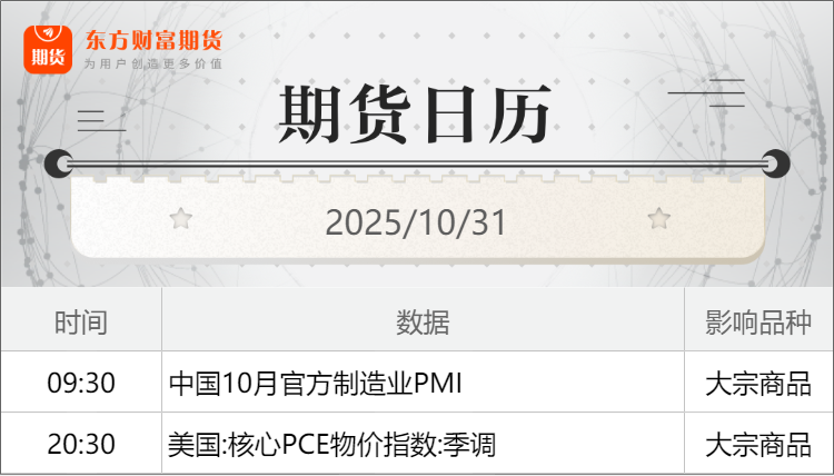 隔夜行情![]() ![]() 每日精选商务部新闻发言人就中美吉隆坡经贸磋商联合安排答记者问 全球央行Q3购金规模环比大增28%!WGC报告显示黄金需求依旧稳健 美参议院通过终止特朗普全面关税政策决议 宏观产经新华社:当地时间10月30日,国家主席习近平在釜山同美国总统特朗普举行会晤。习近平指出,中美关系在我们共同引领下,保持总体稳定。两国做伙伴、做朋友,这是历史的启示,也是现实的需要。两国国情不同,难免有一些分歧,作为世界前两大经济体,时而也会有摩擦,这很正常。面对风浪和挑战,两国元首作为掌舵人,应当把握好方向、驾驭住大局,让中美关系这艘大船平稳前行。 新华社:目前,5000亿元新型政策性金融工具已全部完成投放,有力支持了一批重点领域和薄弱环节项目建设,预计将拉动项目总投资超7万亿元。科技创新、扩大消费、稳定外贸等是工具重点支持的方向。据统计,国开、进银、农发新型政策性金融工具分别支持项目1054个、360余个、881个,预计可分别拉动项目总投资3.85万亿元、超1.3万亿元、超1.93万亿元。 澎湃新闻:有记者向外交部发言人郭嘉昆提问,七国集团(G7)即将宣布建立关键矿产生产联盟,以对抗中国在该市场的主导地位。请问中方对此有何回应?郭嘉昆表示,我们敦促七国集团切实遵守市场经济原则和国际经贸规则,停止以小圈子规则破坏国际经贸秩序,共同维护世界经济稳定发展。 品种资讯黑色系期货 钢材:据Mysteel,截至10月30日当周,螺纹钢产量连续两周增加,厂库、社库连续三周下降,表需连续三周增加。①螺纹产量212.59万吨,较上周增加5.52万吨,增幅2.67%;②螺纹厂库171.71万吨,较上周减少12.92万吨,降幅7%;③螺纹社库430.81万吨,较上周减少6.67万吨,降幅1.52%;④螺纹表需232.18万吨,较上周增加6.17万吨,增幅2.73%。(我的钢铁网) 焦煤:本周,Mysteel统计523家炼焦煤矿山样本核定产能利用率为84.8%,环比减0.3%。原煤日均产量190.3万吨,环比减0.6万吨,原煤库存431.6万吨,环比减11.5万吨,精煤日均产量75.8万吨,环比减0.3万吨,精煤库存164.5万吨,环比减25.0万吨。(我的钢铁网) 农产品期货 生猪:据监测,截至10月30日14:00时,全国农产品批发市场猪肉平均价格为17.96元/公斤,比昨天下降0.4%;鸡蛋7.35元/公斤,比昨天下降0.3%。(农业农村部) 白糖:巴西航运机构Williams发布的数据显示,截至10月29日当周,巴西港口等待装运食糖的船只数量为86艘,此前一周为86艘;港口等待装运的食糖数量为299.33万吨,此前一周为338.4万吨。(新华财经) 红枣:在疆客商收货积极性较高,积极定园定树,已下树货源积极发运至内地,期现公司点价出货增多,部分客商积极采购旧季货源,样本点库存呈现增长趋势。据Mysteel农产品调研数据统计,10月30日当周,36家样本点物理库存在9348吨,较上周增加245吨,环比增加2.69%,同比增加120.78%。(我的钢铁网) 有色/贵金属期货 沪金:世界黄金协会10月30日发布的数据显示,2025年三季度全球黄金需求总量(包含场外交易 )达1313吨,需求总金额达1460亿美元,创下单季度黄金需求的最高纪录。(人民财讯) 沪铜:智利国家统计局(INE)周四表示,作为全球最大铜生产国,智利9月铜产量同比下降4.5%,至456,663吨。该机构补充称,智利当月制造业产出同比增长5%,但低于经济学家预期的6.9%增幅。(财联社) 碳酸锂:10月30日下午,雅保锂辉石精矿拍卖活动结束:拍卖标的为Wodgina所出1.64万干吨5.21%锂辉石精矿,实际成交价位为人民币含税价7058元/吨,从镇江港自提。(上海有色网) 多晶硅:多晶硅市场延续供需双弱局面,价格整体维稳,买卖双方僵持博弈。尽管头部企业N型致密料报价坚挺于55元/千克,但实际新单批量成交稀少,市场观望情绪浓厚。部分厂家为促成交,零星特规订单价格已下探至49—50元/千克,颗粒硅价格亦在49—51元/千克区间,低位价格出现松动。(我的钢铁网) 能化期货 原油:新加坡企业发展局(ESG)数据显示,截至10月29日当周,新加坡燃料油库存上涨175.4万桶,达到2478.1万桶的两周高点。(新华财经) 玻璃:玻璃产线依旧未有变动,截至10月30日,浮法玻璃行业开工率为76.35%,与23日持平,产能利用率持稳于80.63%;全国浮法玻璃日产量为16.13万吨,连续4周持稳,10月24日-10月30日,全国浮法玻璃产量112.89万吨,环比持平,同比增加1.28%。(隆众资讯) 纯碱:截至10月30日,国内纯碱厂家总库存170.20万吨,较上周四下降0.01万吨,跌幅0.01%。其中,轻质纯碱81.56万吨,环比增加4.80万吨;重质纯碱88.64万吨,环比下降4.81万吨。较周一增加0.96万吨,涨幅0.57%。(隆众资讯) 甲醇:本周(20251024—1030)中国甲醇产量为1968095吨,较上周增加24630吨,装置产能利用率为86.73%,环比涨1.26%。本周国内甲醇恢复涉及产能产出量多于检修、减产涉及产能损失量,导致本周产能利用率上涨。(隆众资讯) 环球视野财联社:贝森特表示,美联储主席第二轮面试即将开始,可以想象在圣诞节前选出美联储主席候选人。赞赏美联储降息25个基点,但不喜欢其措辞。 财联社:欧洲央行将存款利率维持在2.000%不变,维持主要再融资利率在2.150%不变,将边际贷款利率维持在2.400%不变。 新华财经:周四,日本央行维持基准利率在0.5%不变,为连续第六次会议按兵不动,符合市场预期。 每日关注![]() (文章来源:丁冬财经研究中心) |