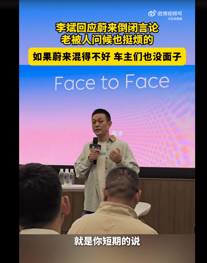 近日,有网友发布蔚来董事长李斌的讲话视频,李斌在“用户面对面”活动表示,今年做出了调整,将长期目标和短期经营目标结合起来。如果蔚来自己不能稳健的经营,那对用户来说是不负责任。“被人问候一下蔚来什么时候倒闭,老被人问候也挺烦,对不对?”