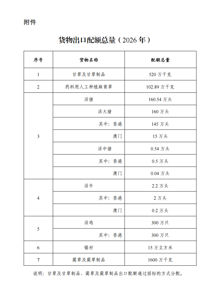 商务部公布2026年货物出口配额总量 全新妙想投研助理,立即体验 商务部10月30日发布公告,公布2026年货物出口配额总量及配额管理有关事项如下: 一、2026年,甘草及甘草制品、药料用人工种植麻黄草、活猪(对港澳)、活牛(对港澳)、活鸡(对香港)、锯材、蔺草及蔺草制品出口配额分别为520万千克、102.89万千克、160.54万头、2.2万头、300万只、15万立方米、1600万千克。 二、出口上述货物的对外贸易经营者应向商务部申请取得配额(全球或者地区配额),凭配额证明文件或者配额招标中标证明文件申领《中华人民共和国出口许可证》(以下简称为出口许可证),凭出口许可证向海关办理货物出口报关验放手续。 三、2026年出口配额(以招标方式分配的配额除外)申请时间自2025年11月1日起,至2025年11月15日止。申请人需将申请材料提交给所在地方的省级地方商务主管部门,由省级地方商务主管部门对申请材料进行核实并转报商务部。 四、商务部依法对受理的申请进行审查,于2025年12月15日前将配额分配给符合条件的申请人。 五、甘草及甘草制品、蔺草及蔺草制品出口配额通过招标的方式进行分配,有关申请的条件和程序等事项另予公布。 六、2026年继续暂停磷矿石、白银出口配额管理,实行出口许可证管理。符合条件的出口磷矿石或白银的对外贸易经营者,可凭有效的货物出口合同申领出口许可证(加工贸易项下出口白银按规定办理),凭出口许可证向海关办理货物出口报关验放手续。 七、本公告所称省级地方商务主管部门,是指各省、自治区、直辖市及计划单列市、新疆生产建设兵团商务主管部门。 ![]() (文章来源:界面新闻) |