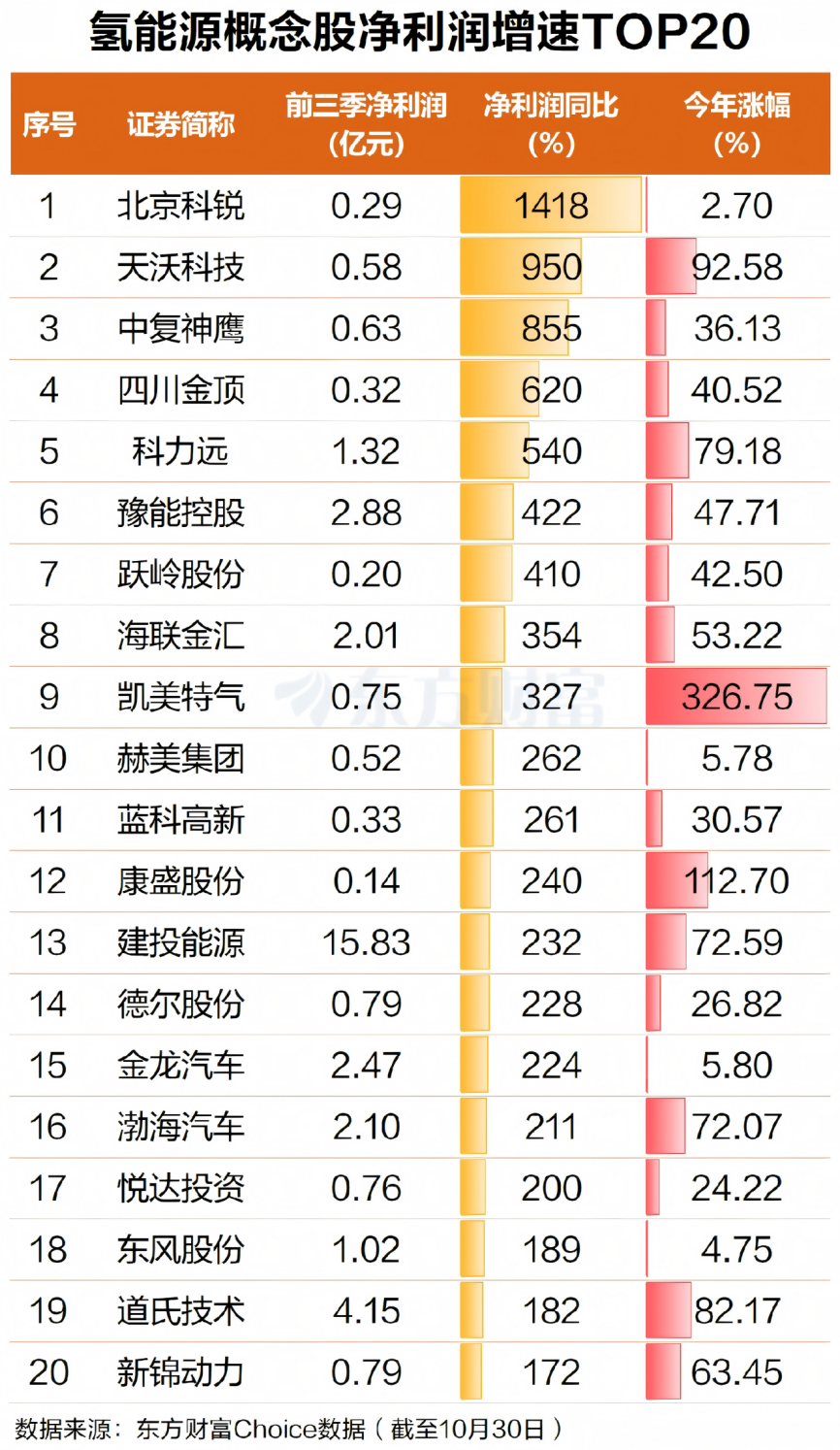 10月31日早盘,氢能源概念股集体异动。截至发稿,科新机电涨超10%,龙蟠科技、海马汽车涨停,昇辉科技、东方精工涨超9%,金龙汽车、天赐材料、信宇人、天沃科技、联美控股、天合光能、福田汽车、永安行等涨超5%。 ![]() 消息面上,10月28日发布的《中共中央关于制定国民经济和社会发展第十五个五年规划的建议》明确指出,“加快建设新型能源体系”。此外,10月24日发布的《中共中央关于制定国民经济和社会发展第十五个五年规划的建议》中也提出,“前瞻布局未来产业,推动氢能和核聚变能成为新的经济增长点”。 近年来,随着碳中和目标的推进,新能源领域成为各国竞相布局的战略高地。而在这场绿色革命中,氢能凭借其清洁性、高效性和广泛适用性,正逐渐从实验室走向产业化落地。氢能源并非新事物,但真正实现规模化应用仍面临诸多挑战。 氢能与核聚变能被视为具有战略意义的未来能源赛道,意味着该领域将在规划、资金、政策、科研支持等方面获得优先支持,同时体现了中国从传统能源向高效、零碳能源体系转型的方向。 在政策扶持与市场需求的双重驱动下,中国氢能产业已步入快速发展的快车道,氢能技术的日益成熟以及应用场景的不断拓展,也让市场对氢气的需求持续攀升。 《2025—2030年中国氢能行业深度分析及发展前景预测研究报告》显示,截至2024年底,中国氢气年产量已达3650万吨,稳居全球首位。目前我国氢气需求总量约为3342万吨,供需基本保持平衡。 在“碳中和”目标的指引下,氢能需求将迎来爆发式增长。分析师预测,到2030年,我国氢气年需求量将达到3715万吨,在终端能源消费中的占比约为5%;到2060年,年需求量将增至1.3亿吨左右,占比提升至20%,成为终端能源消费的重要组成部分。 ![]() 首创证券首席经济学家韦志超指出,在氢能方面,该项技术已进入产业化初期阶段,绿氢制备、储运材料、燃料电池系统等环节实现突破,交通、钢铁、化工等行业已出现明确应用场景。未来十年,工业替代、交通动力、能源存储等核心应用场景预计将有望加速落地,从局部示范走向区域普及,带动全产业链形成万亿级市场规模,成为新能源体系的重要补充。 A股方面,氢能源概念股合计超200只,当前相关公司2025年三季报均已披露完毕。其中,前三季度业绩向好的有137只,占比超55%。据东方财富Choice数据,前三季度净利润增速最高的是氢能源概念股北京科锐,同比增长1417.63%;其次是天沃科技,同比增长950.20%。此外,中复神鹰、四川金顶、科力远等前三季度净利润也均同比增长超500%。 ![]()