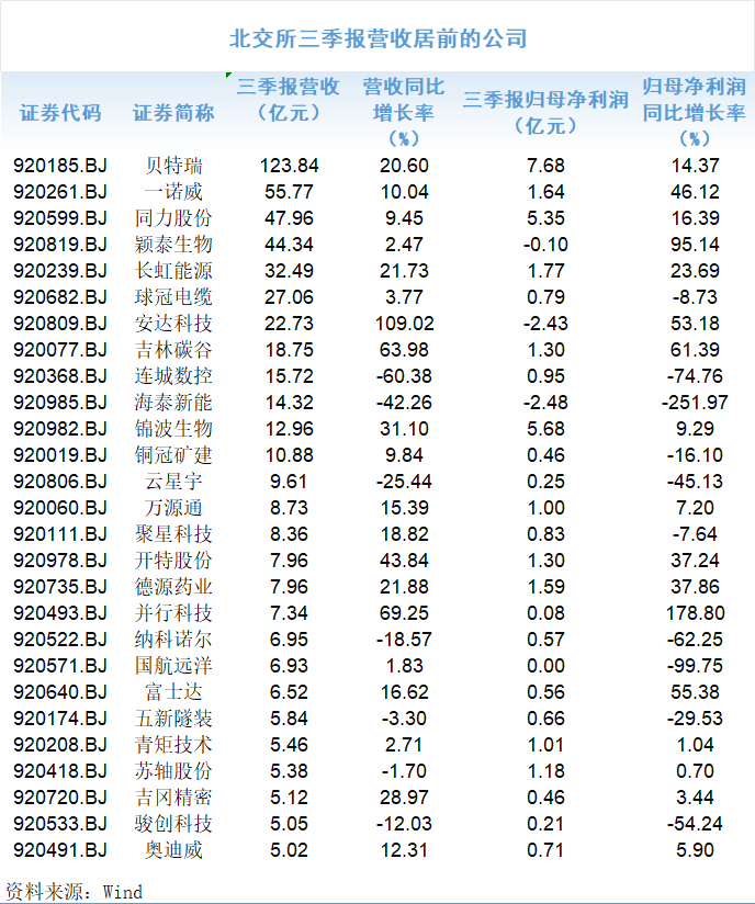 北交所三季报成绩出炉:超八成盈利 多家拟分红 专业金融数据,下一代智能终端 A股三季报披露进入收尾阶段,北交所公司前三季度的经营全貌出炉。 数据显示,截至10月30日,除*ST广道外,279家北交所公司已完成三季报披露,平均实现营业收入5.2亿元,同比增长近6%。其中,230家公司实现盈利,盈利面超八成。 北证50成份股继续发挥业绩“压舱石”作用。Wind统计显示,前三季度,50家指数样本公司合计实现营收约584亿元,累计贡献了近四成营收。 从单家公司情况看,北交所“一哥”贝特瑞居业绩榜首位,成为当期北交所唯一一家营收超百亿元的公司,当期营业收入123.84亿元、归母净利润7.68亿元,同比双双增长。一诺威、同力股份、颖泰生物前三季度的营收也均超过40亿元。 现金分红继续成为三季报披露期的重头戏。目前,逾10家北交所公司送出“现金红包”,累计派现总额超过3亿元。 前三季度盈利面超八成 按上述统计口径,前三季度,已披露数据的279家公司,合计实现营收约1450亿元,归母净利润约92亿元,平均营收5.2亿元,平均归母净利润0.33亿元。 从盈利层面来看,230家公司实现盈利,占比82.44%;169家公司营业收入同比增长,131家公司净利润同比增长。 从营收排名来看,贝特瑞继续“霸榜”,前三季度增收增利,当期营收123.84亿元,同比增长20.6%;归母净利润7.68亿元,同比增长14.37%。 紧随其后的是一诺威、同力股份,前者当期营收55.77亿元、归母净利润1.64亿元,后者当期营收47.96亿元、归母净利润5.35亿元,2家公司前三季度均增收增利。 除上述3家之外,前三季度营收在20亿元至50亿元的还有7家公司,包括颖泰生物、长虹能源、球冠电缆等。 利润方面,4家北交所公司前三季度归母净利润超5亿元,排名依次是贝特瑞、锦波生物、开发科技、同力股份,当期的归母净利润分别达到7.68亿元、5.68亿元、5.55亿元和5.35亿元。 此外,另有16家北交所公司前三季度归母净利过亿,涉及长虹能源、一诺威、德源药业等。 再从业绩增长动力来看,5家公司前三季度营收增逾100%。其中,卓兆点胶当期营收2.58亿元,同比大增164.92%,其余4家为数字人、安达科技、康乐卫士、大地电气。 北交所公司的净利增幅更为亮眼,2家前三季度净利大增10倍。 舜宇精工前三季度增收增利,营收4.94亿元,同比增长9.82亿元,归母净利润0.37亿元,同比大增2586.85%。值得一提的是,该公司的扣非净利润告别亏损,去年前三季度该指标为亏损418.02万元,今年前三季度扣非净利润达1237.73万元,同比增长396.09%。 另一家净利润大幅增长的是格利尔,该公司前三季度营收微降7.01%,达到4.01亿元,但归母净利润0.16亿元,同比大增1271.07%。 ![]() 不过,也有部分公司亏损。海泰新能前三季度营收、净利润双降,当期营收14.32亿元,同比下降42.26%,归母净利润亏损2.48亿元,同比下降251.97%。 该公司对此解释称,营收、净利润下降主要系光伏行业内卷,主要产品市场销售价格下降所致。报告期内,光伏行业主要产品市场销售价格跌破行业成本线,销售毛利空间缩小,毛利额不足以覆盖期间费用,导致净利润亏损。 同样出现亏损的还有安达科技、康乐卫士、宁新新材等,前三季度归母净利润分别亏损2.43亿元、2.29亿元和1.08亿元。 多家公司送出“现金红包” 去年以来,随着新“国九条”出台,上市公司纷纷真金白银回报投资者。北交所公司也是如此,披露三季报之际,多家公司发布了分红预案。 Wind统计显示,截至目前,已有13家北交所公司发布了三季报分红预案,最新披露上述预案的是龙竹科技、开特股份。 整体来看,目前,这13家公司累计派现合计约3.56亿元,八成以上公司(11家)送出千万元以上“红包”。 哪些北交所公司拟大手笔分红?从每股派息金额来看,按现金分红总额排序,鼎佳精密每股派息金额达到0.6元,另有3家每股派息也在0.5元及以上,为世昌股份、奥美森、巴兰仕。 派现总额方面,“发红包”最多的是国航远洋,该公司拟“10派1元”,累计分红5554.07万元;同时,拟派现总额超4000万的有3家,是鼎佳精密、巴兰仕、奥美森。 此外,4家公司拟派现总额在2000万到4000万之间,为世昌股份、开特股份、龙竹科技、视声智能。 另据记者梳理,上述“发红包”的北交所公司,多家三季度增收增利。其中,奥美森前三季度净利润增逾三成,当期营收2.77亿元,同比增长14.25%,净利润0.49亿元,同比增长36.95%。该公司拟“10派5.188元”,累计派现4150.4万元。 其余公司中,视声智能、巴兰仕、海希通讯等,前三季度均增收增利。 全新妙想投研助理,立即体验 (文章来源:第一财经) |