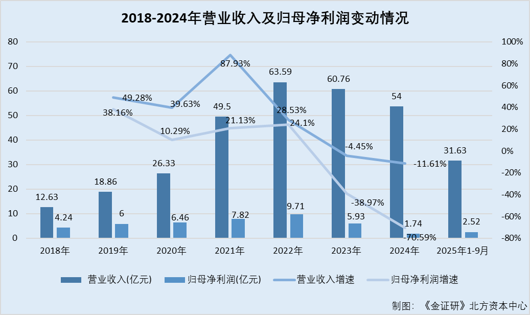 《金证研》北方资本中心 亚一*DL/作者 夕山 映蔚/风控 2025年3月份以来,华熙生物科技股份有限公司(以下简称“华熙生物”)董事长带动整个管理层重回业务一线、重返创业状态。在此背景下,2025年前三季度,华熙生物却业绩“双降”,实现营收31.63亿元,同比下滑18.36%,归母净利润2.52亿元,同比下滑30.29%。不仅如此,2025年前三季度,华熙生物计提信用减值损失和资产减值损失共计9,230.88万元。 而早在2023-2024年,华熙生物营收及归母净利润也现负增长,扣非ROE自2020年起不足15%且截至2024年已下滑至1.57%。华熙生物上市后于2021年7月5日股价达“峰值”,而2021年7月5日至查询日2025年10月29日,华熙生物股价跌幅超80%。另外,2022年,华熙生物收购一家子公司控制权并形成1.78亿元商誉,而该标的2024年亏损,且同期期末超七千万元商誉计提减值准备。2025年上半年,该标的净利润回正,却仅百万余元。 值得注意的是,华熙生物2023年处置一家子公司控制权,而处置后该原子公司成为华熙生物持股40%的联营企业,而招聘平台披露的公司简介显示,该联营企业为华熙生物子公司。另一方面,华熙生物曾在药监局抽检中被限期整改、子公司因虚假宣传遭罚款的情形,或同样值得关注。 一、业绩负增长且股价较历史峰值下跌超80%,扣非ROE呈下滑趋势 就业绩表现来看,科创板上市公司华熙生物2023-2024年营收连续下滑,到了2025年前三季度,其业绩仍现负增长。此外,2020年起,华熙生物的扣非ROE不足15%,截至2024年降至1.57%。 1.1 2023-2024年营收、归母净利润均下滑,2025年1-9月仍现负增长且降幅均超18% 据华熙生物2019-2024年年报及2025年三季报,2018-2024年,华熙生物营业收入分别为12.63亿元、18.86亿元、26.33亿元、49.48亿元、63.59亿元、60.76亿元、53.71亿元,归母净利润分别为4.24亿元、5.86亿元、6.46亿元、7.82亿元、9.71亿元、5.93亿元、1.74亿元。 根据《金证研》北方资本中心研究,2019-2024年,华熙生物营业收入增速分别为49.28%、39.63%、87.93%、28.53%、-4.45%、-11.61%,归母净利润增速分别为38.16%、10.29%、21.13%、24.1%、-38.97%、-70.59%。 2025年1-9月,华熙生物的营业收入为31.63亿元,较上年同期增长-18.36%,归母净利润为2.52亿元,较上年同期增长-30.29%。