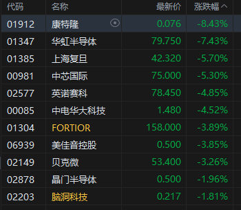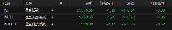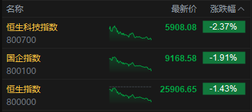 今日,港股三大指数低开低走。截至收盘,恒生指数跌1.43%,报25906.85点,恒生科技指数跌2.37%,国企指数跌1.91%。盘面上,科网股普跌,阿里巴巴跌超4%,快手、腾讯跌超3%,小米、百度、京东跌超2%,联想、哔哩哔哩、网易跌超1%;创新药概念逆市上涨,三生制药涨超11%;高铁基建股跌幅居前,中国中车(601766)跌超10%;半导体板块走弱,华虹半导体跌超7%。
