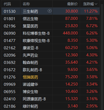 创新药概念逆市上涨,三生制药涨超11%。2025年国家医保谈判10月30日在北京开启。今年国谈在延续医保目录常规调整机制的基础上,首次正式引入“商保创新药目录”机制。银河证券研报认为,医药板块估值经历较长时间调整,近期已呈现显著结构性修复趋势,但公募基金重仓持仓水平仍低于历史均值,2025年在支持引导商保发展的政策背景下,支付端有望边际改善,创新药械有望获益。