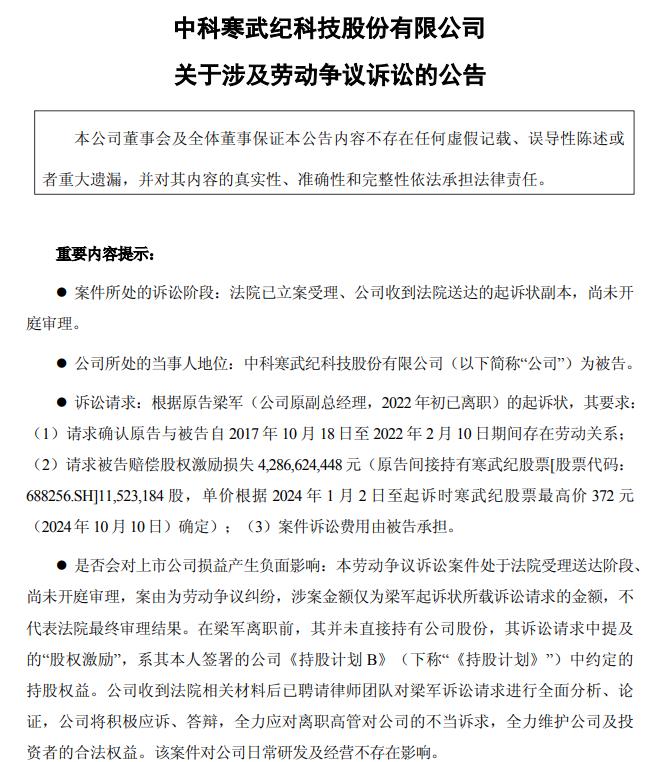 寒武纪:涉及劳动争议诉讼被要求赔偿股权激励损失42.87亿元 案件已立案受理但尚未开庭