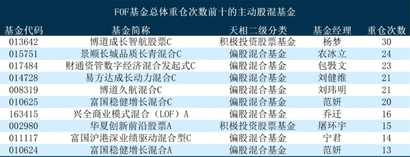 随着公募基金2025年三季报披露全部收官,被称为“基金专业买手”的FOF基金操作路线也浮出水面。 综合持仓类型分布来看,天相投顾统计显示,截至2025年三季度末,FOF基金持有纯债债券基金的规模最大,合计持有规模达373.96亿元,占比为35.64%。FOF基金持有指数债券基金的规模位列第二,合计持有规模达156.72亿元,占比为14.94%。 此外,FOF基金持有规模占比在10%以上的基金类型还包括混债债券基金,持有占比为12.89%,FOF基金持有规模占比在5%以上的基金类型还包括偏股混合基金和纯指数股票基金,持有占比为8.94%和5.71%。 ![]() 与二季度相比,三季度FOF基金持有的基金类型中,共有6种基金类型的规模占比上升,13种基金类型的规模占比下降。其中,FOF基金持有指数债券基金的规模占比提升最为显著,由二季度的11.14%提升至三季度的14.94%。而FOF基金持有灵活配置混合基金的规模占比则明显下降,由二季度的5.31%下降至三季度的3.90%。 ![]() 业绩方面,2025年三季度,整体表现最好的是股票FOF基金,涨幅为27.52%;表现最差的是债券FOF基金,涨幅为1%。 其中,截至2025年三季度末,表现最好的普通FOF基金为国泰优选领航一年持有期混合(FOF),该基金近一年收益率为52.59%;表现最好的养老目标FOF基金为工银养老2050五年持有Y,该基金近一年收益率为35.61%。 具体来看,在FOF产品重仓的主动股混合基金中,截至2025年三季度末,博道基金量化投资总监杨梦管理的博道成长智航股票C被FOF基金总体重仓次数最高,达30次;截至10月30日,该基金的年内业绩达48.23%。其次为景顺长城基金明星基金经理农冰立管理的景顺长城品质长青混合C,被FOF基金总体重仓24次;截至10月30日,该基金的年内业绩为72.44%。 此外,包斅文管理的财通资管数字经济C、刘健维管理的易方达成长动力混合C、刘玮明管理的博道久航混合C、知名基金经理范妍管理的富国稳健增长混合C,均被FOF基金重仓超20次。 乔迁管理的兴全商业模式混合(LOF)A、屠环宇管理的华夏创新前沿股票A、宁君管理的富国沪港深业绩驱动混合型C、范妍管理的富国稳健增长混合A,被FOF基金重仓次数则均在10次以上。 ![]() 而在重仓规模方面,FOF基金总体重仓规模前十的主动股混基金名单与重仓次数前十的名单差异较大。 具体来看,截至2025年三季度,易方达科融混合被FOF基金总体重仓规模最高,达5.87亿元,较二季度增长52.80%;其次为华夏创新前沿股票A,被FOF基金总体重仓达4.85亿元,较二季度增长72.28%。 此外,FOF基金外部重仓数据方面(剔除FOF基金持有自家旗下基金的情况),华夏创新前沿股票被FOF基金外部重仓规模最高,达4.85亿元,较二季度增加85.14%;其次为财通资管数字经济C,被FOF基金外部重仓达2.81亿元,较二季度增加220.19%;华商润丰混合C则获2.81亿元的重仓规模位居第三。 值得一提的是,无论是从FOF基金总体重仓规模,还是外部重仓规模前十的主动股混基金管理人来看,不少都是业内知名的基金经理,如易方达基金郑希、富国基金范妍、兴证全球基金谢治宇与乔迁、景顺长城基金农冰立、中欧基金周蔚文、华商基金胡中原、平安基金周思聪。 ![]() 在主动债券基金中,FOF基金外部重仓规模前十的主动债券基金与重仓次数前十的基金名单差异较大。 具体来看,截至 2025 年三季度,富国国有企业债债券C被FOF基金总体重仓规模最高,达10.09亿元,较上季度增长4239.79%;其次为易方达岁丰添利债券(LOF)C,被FOF基金总体重仓达9.98亿元,较上季度增长22.96%。 另据外部重仓数据,鹏华丰恒债券A被FOF基金外部重仓规模最高,达8.04亿元,较上季度增长98.70%;其次为广发景明中短债A,被FOF基金外部重仓达7.81亿元,较上季度增加3957.45%。 ![]() 在指数基金中,截至2025年三季度,海富通中证短融ETF被FOF基金总体重仓规模最高,达32.90亿元,较上季度上升100.20%;其次为平安中高等级公司债利差因子ETF,被FOF基金总体重仓达15.95亿元,较上季度增长345.46%。 另据外部重仓数据,海富通中证短融ETF被FOF基金外部重仓规模依然最高,达32.73亿元,较上季度上升99.17%;其次为平安中高等级公司债利差因子ETF,被FOF基金外部重仓达15.29亿元,较上季度增加342.09%。 ![]()