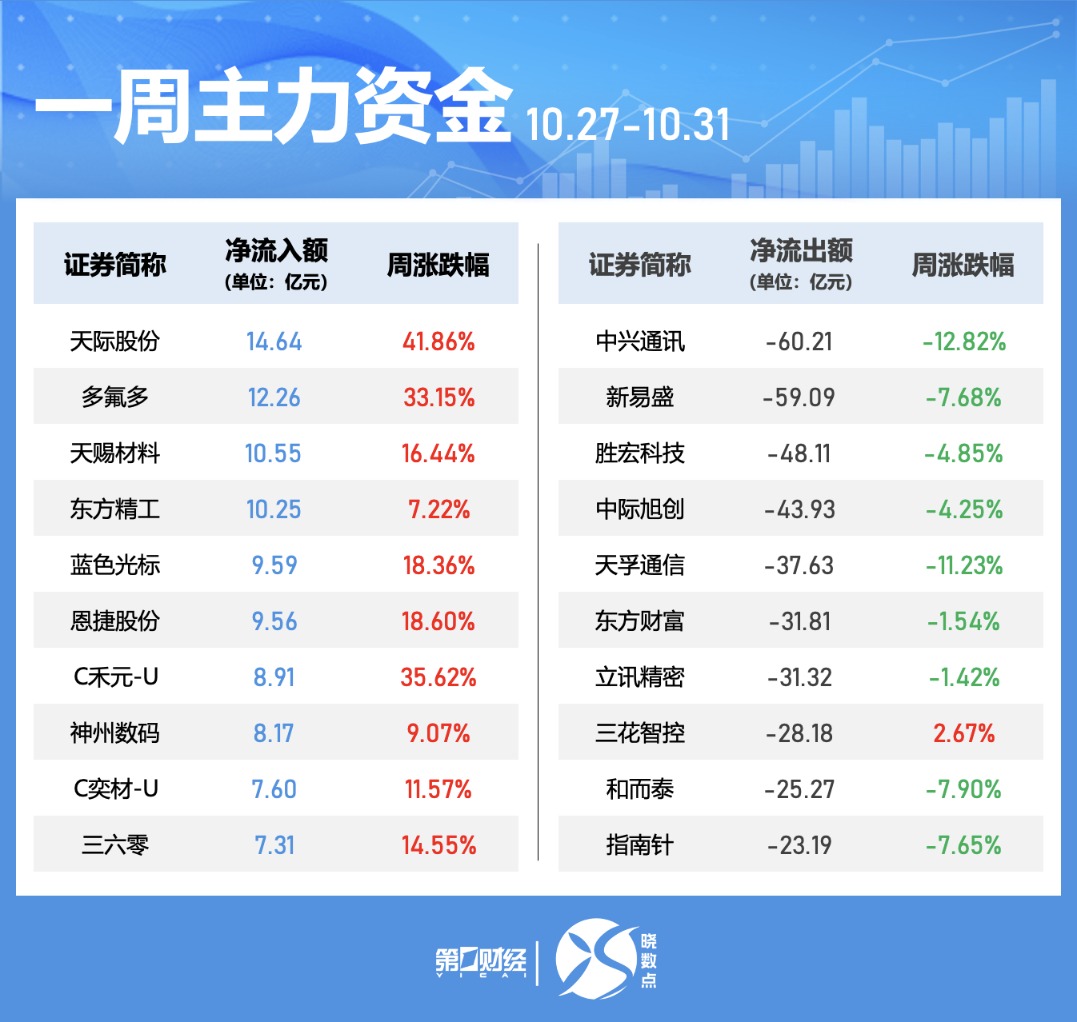 个股方面,本周天际股份、多氟多、天赐材料获主力净流入居前,分别为14.64亿元、12.26亿元、10.55亿元;净流出方面,中兴通讯、新易盛、胜宏科技遭主力净流出居前,分别为60.21亿元、59.09亿元、48.11亿元。
