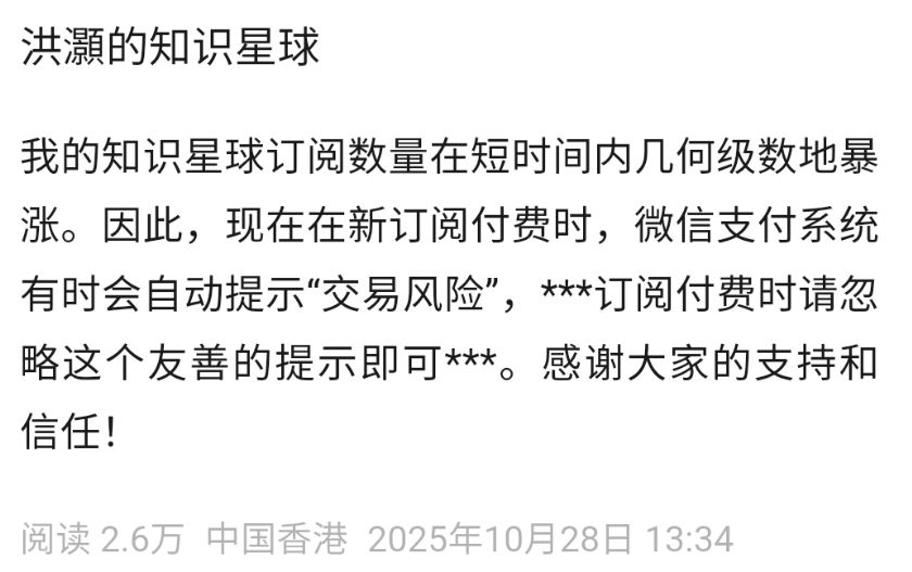 8天入账675万元 著名经济学家洪灏也进军知识付费了 专业金融数据,下一代智能终端 最近,经济学家洪灏的一则动态,引发不少金融从业者和投资人关注。 截至11月1日,其创办的知识星球成员数在短短8天内突破7500人,以899元/年的订阅价计算,毛收入预计已达近675万元,这一数字远超不少券商首席分析师的年薪。 影响力+涨价预期 快速吸金 10月25日,洪灏在其个人微信公众号上发文宣布“应广大读者的需求,我的星球正式上线”。 ![]() 截图自:洪灏的知识星球 截至10月31日,洪灏的知识星球洪灏宏观策略已经有7300+成员,仅过了一天,该星球的成员数量又增至7500+,以单价899元计算,8天时间的毛收入近675万(根据知识星球的规定,加入星球后,72小时内可以申请退款)。 ![]() 截图自:洪灏个人微信公众号 由于订阅用户短期内增长较快,甚至导致微信支付系统有时会自动提示“交易风险”,日前他还在个人微信公众号上就相关的付费问题发布了一则声明。 公开信息显示,目前洪灏的知识付费布局采用 “公众号+知识星球”双轨模式:公众号主打深度分析文章,需单独付费阅读(据记者观察,目前洪灏个人微信公众号上的大部分文章都需要付费才能阅读全文);知识星球则聚焦实时观察,形成独立付费体系。 ![]() 截图自:洪灏个人微信公众号 据其公众号宣称,目前899元包年的价格在试运营期后将大幅上调。 金融圈跟风入局 前首席们的 “知识变现” 热潮 据公开信息,洪灏此前曾多年从事卖方业务,他曾在交银国际担任策略主管近10年;2022年,洪灏加入思睿集团出任首席经济学家;今年4月,他加入华福国际担任CEO,重回卖方序列,不过没过多久就宣布辞职,并转而担任其本人公司Lotus Asset Management的管理合伙人兼首席投资官。彼时,洪灏曾向记者表示:“还是更喜欢买方市场,未来将专心做好旗下对冲基金的投资管理工作。”此番将重心放在付费知识星球上,可能预示,他又要转换赛道。 而洪灏知识星球的爆发并非个例。近年来,曾任券商首席、基金经理等职务的金融机构人士 “下海” 做知识星球已形成趋势,凭借行业背书与专业标签,成为知识付费领域的 “特殊玩家”。 前开源证券研究所副所长、电子行业首席分析师刘翔是较早入局者。据媒体报道,2024年他推出的知识星球在几个月内价格从最开始的199元涨到了699元,从过千的订阅人数来看,短时间内收入预计破百万。此外,经济学家刘煜辉等业内知名人士也早已开通了付费星球(目前刘煜辉知识星球的定价为488元/年)。 想炒股,先开户!选丁冬财经证券,行情交易一个APP搞定>> (文章来源:每日经济新闻) |