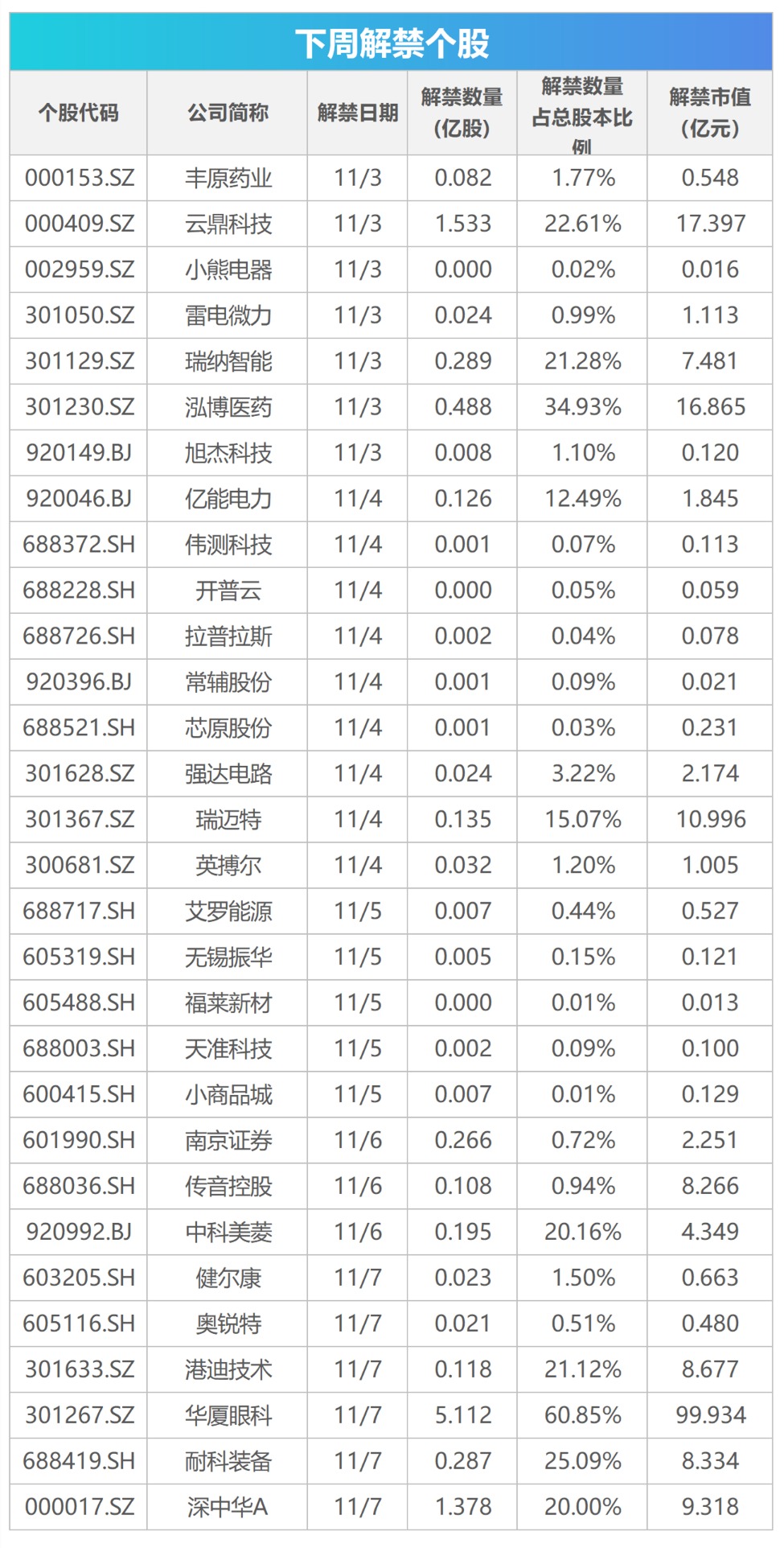 下周限售股解禁市值超203亿元 Wind数据显示,下周,限售股上市数量为10.28亿股,市值约为203.22亿元。华厦眼科是下周解禁市值最大的一家公司,华厦眼科将有5.11亿股限售股在11月7日到期,占总股本比例为60.85%,市值约为99.93亿元。 此外,云鼎科技、泓博医药、瑞迈特、深中华A、港迪技术、耐科装备、瑞纳智能等公司限售股解禁市值较大,均超过7亿元。 ![]() 【新股机会】 下周将有3只新股发行。具体来看,11月3日发行的是北矿检测,申购代码为920160;11月7日发行的是恒坤新材、南网数字,申购代码分别为787727、301638。 ![]() (文章来源:第一财经) |