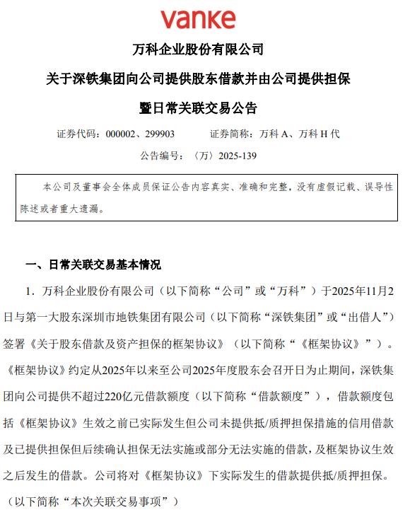 11月2日,万科发布公告,于2025年11月2日,公司与公司主要股东深圳地铁集团订立贷款框架协议,据此,深圳地铁集团同意向公司提供本金总额最多为人民币220亿元的贷款,主要涵盖:深圳地铁集团于生效日前根据指定协议已向公司提供的无担保信用贷款;及深圳地铁集团于生效日或之后根据正式协议,按照贷款框架协议的条款及条件向公司提供的有担保贷款。 公告显示,万科拟于2025年至公司2025年度股东周年会(预期不迟于2026年6月30日举行)日期期间提取或已提取的最高贷款金额人民币220亿元。贷款所得款项将用于偿还及结清公司在公开市场发行的各类债务的本金与应计利息以及深圳地铁集团同意的指定贷款应计利息。