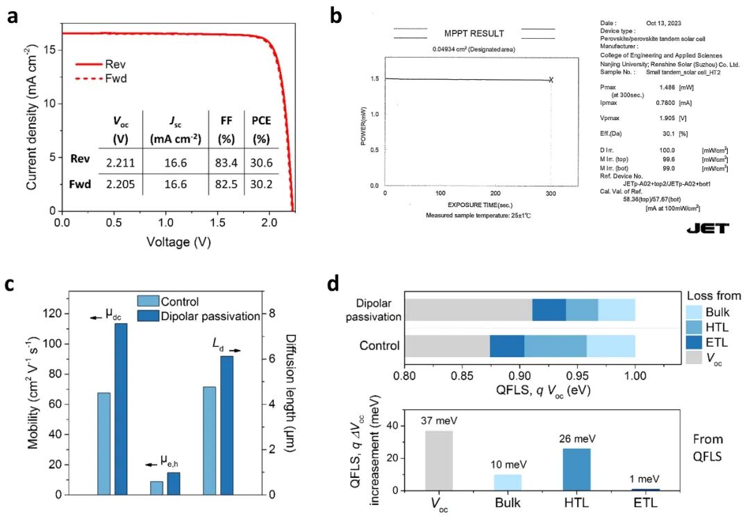 我国下一代光伏技术取得新进展 光电转化效率突破30% 全新妙想投研助理,立即体验 我国太赫兹探测钙钛矿光伏技术登上权威期刊《自然》 我国下一代光伏技术取得新进展,南京大学谭海仁团队和国防科技创新研究院常超团队联合运用太赫兹技术,对全钙钛矿叠层光伏电池内部载流子输运行为实现精准、无损探测。改进后的电池光电转化效率突破30%,国际权威学术期刊《自然》10月28日在线发表相关研究论文。 ![]() 这是南京大学等单位研制的光电转化效率30.1%全钙钛矿叠层光伏电池。(受访者供图) 据谭海仁介绍,钙钛矿光伏电池长期难以提升光电转化效率,主要难在无法精确探测和调控钙钛矿材料中的载流子。 而常超团队开发的非接触式、无损太赫兹辐射探测光谱表征技术,通过数十次实验有效解决了这一难题。太赫兹光子具有亚带隙能量特性,能够特异性地探测钙钛矿中自由载流子浓度,不会引发带间跃迁干扰。同时,太赫兹场振荡与载流子动量弛豫的皮秒级同步特性,为研究载流子输运行为提供了独特的时间分辨能力。 此次研究中科研人员发现,钙钛矿吸光层和空穴传输层之间的界面,是载流子损耗较多的区域。团队为此设计出一种偶极钝化层,它就像城市里的单行道,一头连着钙钛矿吸光层,一头连着空穴传输层,驱使载流子向空穴传输层运动。 太赫兹辐射探测诊断结果清晰揭示了偶极钝化策略在促进电荷传输、抑制损耗等方面的微观机制。实验数据显示,经钝化处理的钙钛矿薄膜,总载流子迁移率提升68%以上,载流子扩散长度延长近30%。 ![]() 太赫兹技术指导制备高效率全钙钛矿叠层光伏电池。(受访者供图) 经国际权威第三方机构认证,用钝化处理技术制备的新型全钙钛矿叠层光伏电池,光电转化效率达30.1%,这是此类电池效率首次突破30%,目前已被国际《太阳能电池效率表》收录。 论文第一作者、南京大学现代工程与应用科学学院助理教授林仁兴表示,此次研究凸显了太赫兹光谱技术在揭示载流子本征物理特性方面的独特优势,为未来设计高效材料提供了新的技术路径。 来源:新华社 (文章来源:中国证券报) |