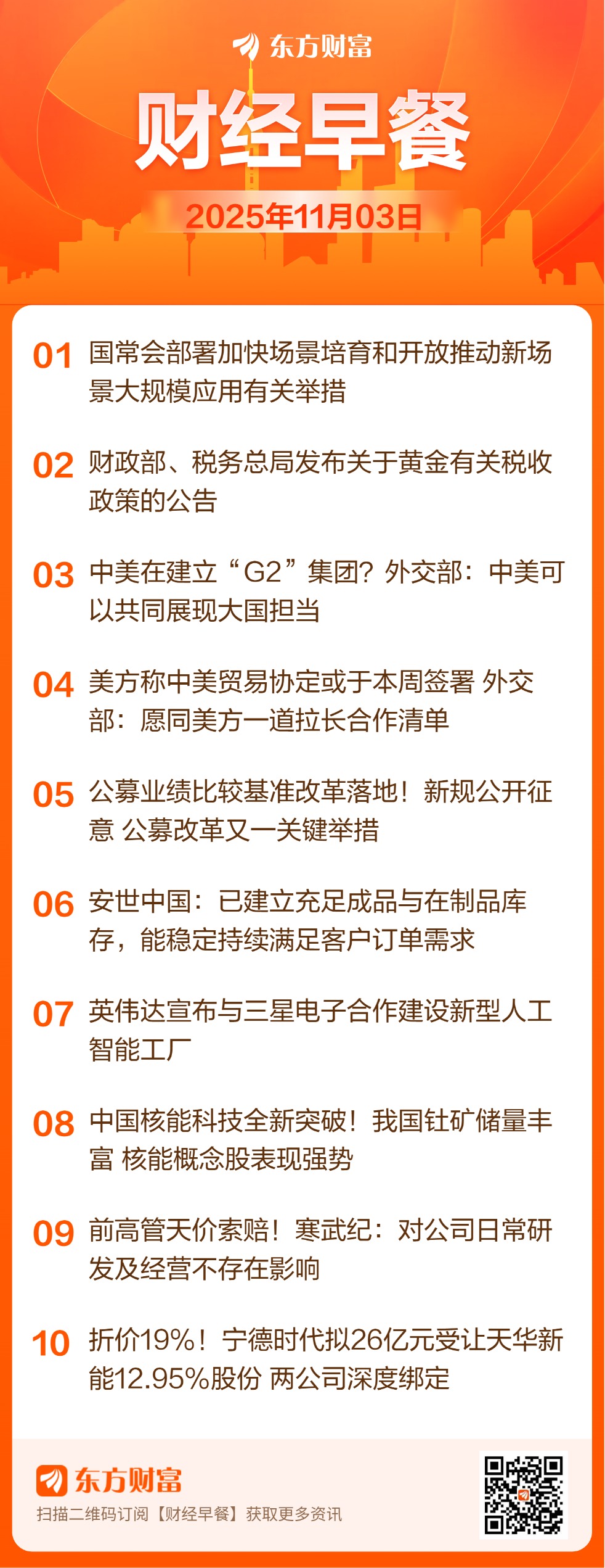 ![]() 每日精选国务院常务会议: 国务院总理李强主持召开国务院常务会议,部署加快场景培育和开放推动新场景大规模应用有关举措。其中提到面向产业发展前沿和重大技术攻关需求,优先布局一批新领域新赛道场景、高价值小切口场景和跨区域跨领域综合场景,做好场景资源开放、中试验证创新、商业模式探索等工作,促进形成从技术突破到产业应用的完整闭环。 国务院常务会议研究深化重点领域改革扩大制度型开放工作。其中提到,要着力深化重点领域改革,带动高水平对外开放,提升商品市场开放水平,优化服务市场准入规则,完善要素市场开放监管制度。要注重发挥自由贸易试验区、自由贸易港等高能级开放平台优势,探索形成更多可复制可推广的改革成果,持续提升制度型开放效能。 黄金税收: 财政部、国家税务总局发布《关于黄金有关税收政策的公告》,明确黄金有关税收政策。根据公告,在2027年底前,对会员单位或客户通过上海黄金交易所、上海期货交易所交易标准黄金,卖出方会员单位或客户销售标准黄金时,免征增值税。业内人士表示,上述政策是对现有黄金市场政策的进一步完善,可以更好区分黄金的商品和金融属性,总体看,我国对黄金产业的税收政策支持力度要优于国际主要黄金市场政策支持力度。 基金业绩比较基准指引: 证监会发布了《公开募集证券投资基金业绩比较基准指引(征求意见稿)》,向社会公开征求意见。其中提到,管理人建立以基金投资收益为核心的考核与薪酬体系,当主动权益基金长期业绩显著跑输基准时,相关基金经理的绩效薪酬应大幅下调。这是引导基金行业进一步回归投资者利益导向的重要安排。 安世半导体: 安世中国发布致客户公告函称,荷兰安世半导体单方面决定自2025年10月26日起停止向位于东莞的封装测试工厂(ATGD)供应晶圆。目前公司库存充足能够满足客户至年底乃至更长时间的订单需求。公告函还称,公司对在短期内完成验证、并自明年起无缝衔接满足所有客户需求充满信心。 中国商务部新闻发言人就安世半导体相关问题应询答记者问时表示,我们将综合考虑企业实际情况,对符合条件的出口予以豁免。 寒武纪被起诉: 寒武纪发布公告,公司近日收到北京市海淀区人民法院送达的起诉状,寒武纪原副总经理、首席技术官(CTO)梁军以劳动争议为由起诉公司,索赔金额达42.87亿元。目前案件已立案受理,但尚未开庭审理。寒武纪方面表示,该案件属于劳动争议纠纷,诉讼请求金额仅为原告主张,不代表法院最终判决结果。公司将积极应诉,并称案件对日常研发和经营活动不存在影响。此前梁军因股权回购问题曾提起相关诉讼均败诉。 英伟达韩国业务布局: 英伟达宣布,计划与韩国政府和主要公司合作,在韩国部署多达26万枚图形处理器(GPU),拟在韩国建立大规模的人工智能(AI)工厂。该计划涉及韩国政府和包括三星电子、SK集团、现代汽车集团等在内的主要行业领导者。 热点题材核能核电: 据报道,我国首次实现基于熔盐堆的钍铀核燃料转换,证明了熔盐堆核能系统利用钍资源的技术可行性,为我国率先实现钍基熔盐堆的工业应用,提供了核心科技支撑。而据央视新闻报道,长期以来,“铀资源匮乏”制约着中国核能产业的发展。钍基熔盐堆的横空出世,让中国核能迎来“换道超车”的关键契机。 创新药: 2025年国家医保谈判在北京开启。今年国谈在延续医保目录常规调整机制的基础上,首次正式引入“商保创新药目录”机制。商保创新药目录主要纳入超出保基本定位、暂时无法纳入基本目录,但创新程度高、临床价值大、患者获益显著的创新药。 AI智能体: 目前,各大厂、创业公司、SaaS厂商正在加速推动智能体的商业落地进程,各大场景的AI智能体厂商也在2025年实现了初步的收入积累,机构认为,后续的规模化放量阶段也在渐行渐近。各类AI智能体框架与平台的涌现在技术生态层面为AI智能体产品和技术的升级提供支持,助力产业整体的持续加速迭代。 存储芯片: 据媒体报道,三星、SK海力士、闪迪等存储厂商正纷纷投入HBF技术的研发。在前不久举行的2025 OCP全球峰会上,SK海力士推出了名为“AIN系列”的全新产品线,其中就包含HBF。在此之前,该公司与闪迪签署了一项谅解备忘录,并表示双方将共同制定HBF技术规范。与此同时,三星也已经启动其自有HBF产品的早期概念设计工作。 被动元件: 继存储芯片后,近期被动元件也加入了涨价行列。日前,据媒体报道,由于AI应用带动钽电容需求大增,被动元件大厂国巨集团旗下基美(Kemet)向客户发出钽电容涨价通知。此为基美今年第二波调涨,相较第一波,调涨的客户从代理商扩及直销客户,范围更广。供应链透露,涨价幅度高达20%~30%。 商业航天: 近日,世界最大蒙皮拉伸机正式通过验收。该装备以数字化技术实现了从实验室到生产线的创新转化,标志着我国在航空制造、高铁、高精尖建筑等领域的国产化进程取得重大突破。目前,该设备与配套的装备均达到世界领先水平。此项技术填补了航空制造关键环节的空白,为高端装备制造业高质量发展注入新动能。 脑机接口: 埃隆·马斯克在社交平台上转发了关于全球首位植入Neuralink脑机接口设备的人诺兰·阿博的相关报道。该报道称,自接受植入脑机接口设备21个月后,阿博目前不仅能用意念打字,还在学习微积分预科课程,