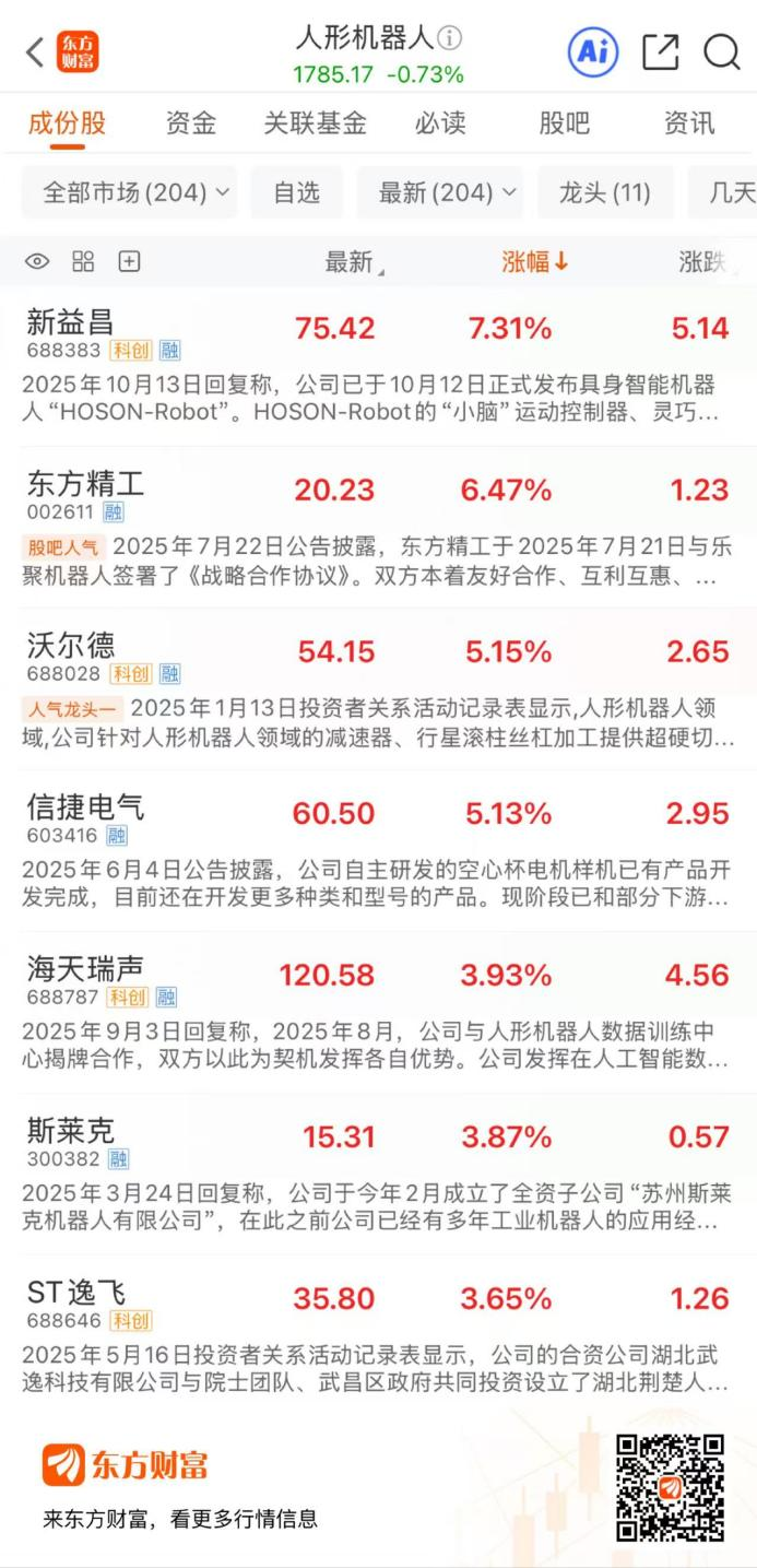 11月3日早盘,人形机器人概念多股异动,截至发稿,新益昌涨超7%,东方精工涨超6%,沃尔德、信捷电气涨超5%,海天瑞声、斯莱克、ST逸飞、上海电气、精工科技、九鼎投资等多股涨超3%。 ![]() 消息方面,11月2日,第十五届全运会火炬传递在深圳举行,全球首款5G-A人形机器人“夸父”以深圳站“0号”火炬手身份亮相。据悉,“夸父”是由乐聚智能(深圳)股份有限公司开发的全球首款搭载5G-A技术的人形机器人,是国内首款可跳跃、可适应多地形行走的开源鸿蒙人形机器人。 凭借稳定的5G-A连接保障以及全新的运动控制算法,“夸父”首次打破对手持遥控器现场控制的依赖,在无技术人员陪跑的情况下,独立自主完成火炬传递全流程任务,实现步伐稳健、动作自然的拟人奔跑。 公开资料显示,乐聚智能成立于2016年,专注于人形机器人核心技术自主研发与产业化,目前已构建“大脑—小脑—操作系统—本体”全栈技术体系,陆续推出AELOS(小型)、ROBAN(中型)、KUAVO(大型)等机器人产品,并在科研商业、工业、家庭等场景实现批量交付应用。 日前,乐聚智能在深圳证监局办理辅导备案登记,拟首次公开发行股票并上市。据辅导备案报告,乐聚智能计划于2026年3月至2026年6月期间完成辅导工作,考核评估辅导结果,并做好首次公开发行股票申报准备工作。作为宇树科技之后,国内第二家公开推进IPO进程的人形机器人公司,外界普遍认为乐聚智能的估值已经超过10亿美元。 此前的10月22日,乐聚智能官方对外宣布,已完成近15亿元 Pre-IPO 轮融资。本轮融资由深投控资本、深圳龙华资本、前海基础投资、石景山产业基金、东方精工、拓普集团、中信金石、中证投资、道禾长期投资、盛奕资本、联新资本、探针创投、合肥产投、玖兆投资及中美绿色基金共15家机构联合投资。 ![]() 图片来源:乐聚机器人官方公众号 从产业链布局方面来看,乐聚智能陆续投资了泉智博(一体化关节)、立聚动力(电机)、灵心巧手(灵巧手)、刻行时空(数据平台)、具脑磐石(具身大脑)、具识智能(操作系统)等上下游企业。同时,与东方精工联合打造了大规模人形机器人产线;与和而泰、东方精工联合成立人形机器人控制器公司;与海晨股份联合成立生产物流场景解决方案的合资公司。 从场景应用方面来看,公司将持续围绕科研、商服、工业、家庭等场景进行产业化落地。目前已与华为、腾讯、火山引擎、阿里云、中国移动、中国电信、荣耀、中国一汽、中兴通讯、巨一科技、南方电网、海信、海尔、润泽集团等40余家生态伙伴展开广泛产业应用探索。 A股方面,股权穿透信息显示,东方精工直接持股乐聚智能,占比超6%。另据公开资料不完全统计,直接或间接持有乐聚智能的上市公司还有兆丰股份、共进股份、南微医学、润欣科技、大众公用、中信证券、贵州茅台等10余家公司;与乐聚智能存在业务合作的公司还有和而泰、豪森智能、海晨股份、富佳股份等。 从股价表现看,其中多家公司年内股价出现大涨。截至11月2日,兆丰股份年内已涨超270%,和而泰涨超184%,东方精工涨超96%,大众公用涨超69%,海晨股份涨超41%,共进股份涨超34%,富佳股份、豪森智能涨超20%。 ![]()