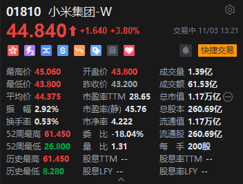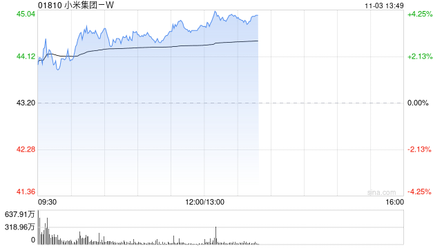 11月3日消息,小米集团午后涨幅扩大至超4%,报45.06港元。截至发文,小米集团涨3.8%,成交额逾61亿港元。