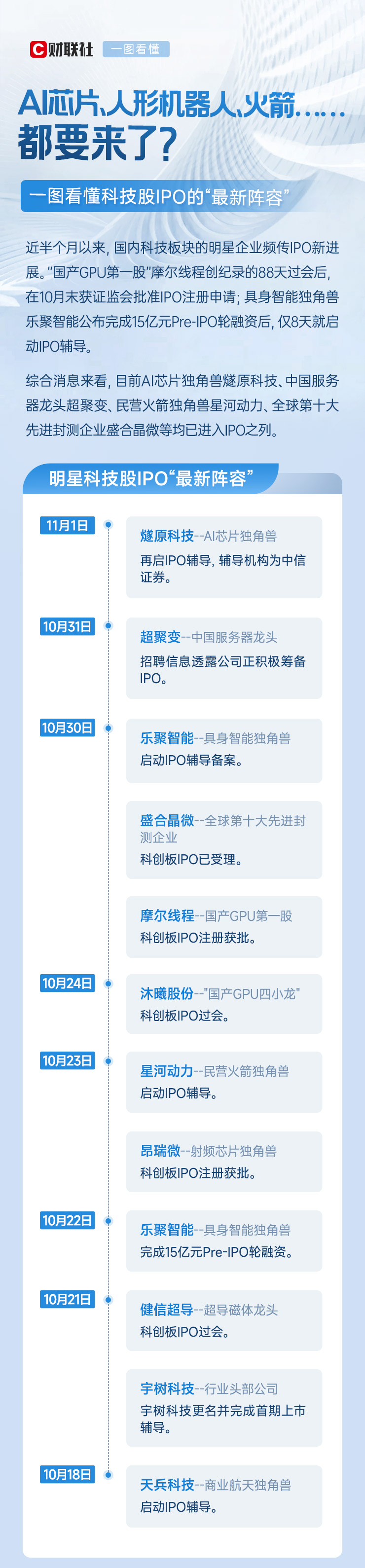 ①科技板块明星企业IPO频传新进展,乐聚智能完成15亿元Pre-IPO轮融资后8天启动IPO辅导备案。②燧原科技、超聚变、星河动力、盛合晶微等也已进入IPO之列。③尚处IPO进程中的明星科技企业涵盖了AI芯片、服务器、火箭和先进封测等领域。