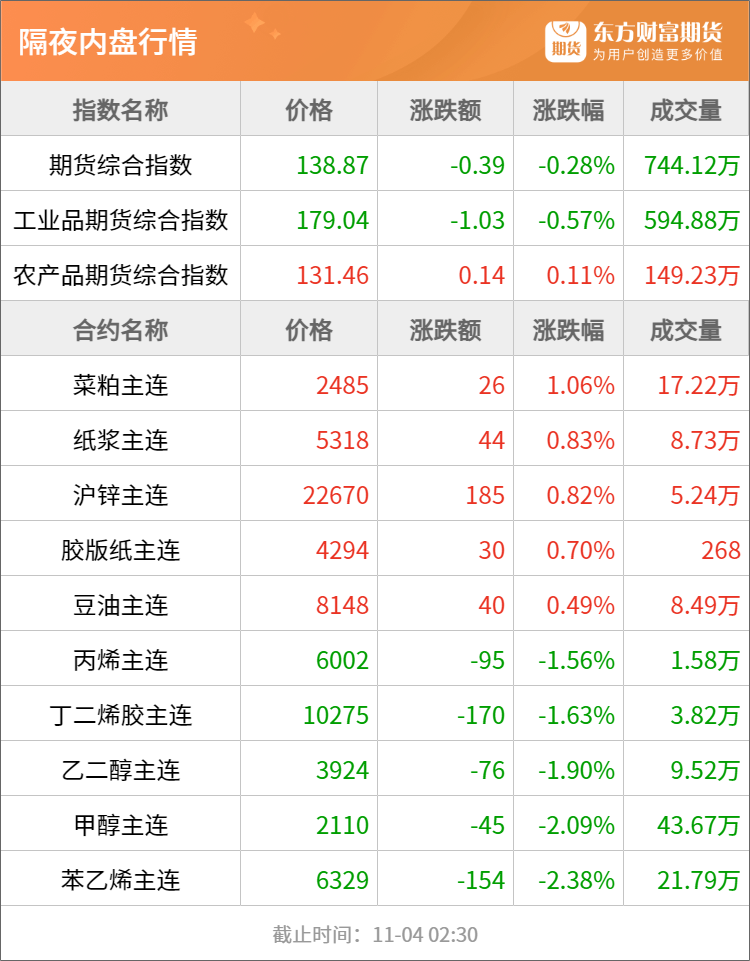 隔夜行情![]() ![]() 每日精选暂停实物金提取不到1天 工行刚刚恢复!周大福:应有关税收政策 今起部分产品涨价 二育补栏高峰已过 未来两月猪价欲破新高需点燃消费“引擎” “弱现实”与“强预期”博弈 多晶硅市场涨势能否延续? 宏观产经澎湃新闻:11月3日,外交部发言人毛宁主持例行记者会。法新社记者提问,美国财长贝森特昨日表示,如果中国继续阻止稀土出口,美国可能会对华加征关税。中方对此有何回应?毛宁表示:“关于中国的稀土出口管制政策,中方主管部门已经多次阐明了立场。中美经贸团队吉隆坡磋商的成果充分说明,对话和合作是解决问题的正确途径,威胁和施压无助于问题的解决。”毛宁强调,当务之急是中美双方应当认真落实两国元首釜山会晤达成的重要共识,为中美的经贸合作和世界经济注入更多的稳定性。 商务部网站:2025年10月31日至11月1日,商务部安全与管制局江前良局长与欧委会贸易总司雷东内副总司长在布鲁塞尔举行“升级版”中欧出口管制对话磋商。双方就出口管制领域彼此关切进行深入、富有建设性的沟通。双方同意继续保持沟通交流,促进中欧产业链供应链稳定与畅通。 财联社:经国务院批准,近日中国人民银行与韩国银行续签双边本币互换协议,互换规模为4000亿元人民币/70万亿韩元,协议有效期五年,经双方同意可以展期。双方再次续签双边本币互换协议,有助于进一步深化两国货币金融合作,促进双边贸易便利化,维护金融市场稳定。 品种资讯黑色系期货 钢材:10月下旬,21个城市5大品种钢材社会库存905万吨,环比减少31万吨,下降3.3%,库存继续小幅下降;比年初增加246万吨,上升37.3%;比上年同期增加205万吨,上升29.3%。(中钢协) 铁矿石:2025年10月27日-11月02日中国47港到港总量3314.1万吨,环比增加1229.8万吨;中国45港到港总量3218.4万吨,环比增加1189.3万吨;北方六港到港总量1585.9万吨,环比增加490.0万吨(Mysteel) 2025年10月27日-11月2日Mysteel全球铁矿石发运总量3213.8万吨,环比减少174.5万吨。澳洲巴西铁矿发运总量2759.2万吨,环比减少166.7万吨。澳洲发运量1895.1万吨,环比减少89.2万吨,其中澳洲发往中国的量1605.8万吨,环比减少60.6万吨。巴西发运量864.1万吨,环比减少77.5万吨。(Mysteel) 农产品期货 棉花:国际棉花咨询委员会(ICAC)发布的最新数据显示,全球2025/26年度棉花产量预估为2539.96万吨(上月预估为2543.86万吨);2025/2026年度棉花期末库存预估为1622.79万吨(上月预估为1537.87吨),同比增加2.5%。(新华财经) 菜油:截止到2025年10月31日当周,沿海地区主要油厂菜籽库存为0万吨,较上周减少0.6万吨;菜油库存为3.8万吨,较上周减少0.4万吨;未执行合同为1.5万吨,较上周减少0.5万吨。(我的钢铁网) 棕榈油:据船运调查机构SGS公布数据显示,预计马来西亚10月1-31日棕榈油出口量为1282036吨,较上月同期出口的1013140吨增加26.54%。南部半岛棕榈油压榨商协会(SPPOMA)数据显示,2025年10月1-31日马来西亚棕榈油单产环比上月同期增加4.50%,出油率环比上月同期增加0.20%,产量环比上月同期增加5.55%。(新华财经) 豆油:截至2025年10月31日,全国重点地区豆油商业库存121.58万吨,环比上周减少3.45万吨,降幅2.76%。(我的钢铁网) 生猪:牧原股份在互动平台表示,公司2025年9月的生猪养殖完全成本在11.6元/kg左右,内部最优秀的场线成本可以做到10.5元/kg。对标国内外优秀成绩,公司的养殖成绩、管理水平仍有较大进步空间,后续公司会在业务管理、组织管理层面持续发力,寻求养猪技术上的创新突破,实现养殖效率的进一步提升,持续降低养殖成本。(每经网) 有色/贵金属期货 黄金:周大福珠宝对界面新闻表示,近日发布的黄金有关税收政策,为黄金采购和生产带来额外成本。为此,周大福珠宝自11月3日起对部分黄金产品进行价格调整。(界面新闻) 多晶硅:有投资者问,最近几个月,上游多晶硅厂家严重炒作价格,公司能否考虑下自建或收购多晶硅生产线,把主动权掌握在自己手中?阿特斯在互动平台表示,当前多晶硅环节产能供给过剩,公司暂无自建或收购多晶硅的计划。(财联社) 氧化铝:2025年10月(31天)中国冶金级氧化铝产量环比增长2.39%,同比增加6.79%。截至10月底,中国冶金级氧化铝的建成产能为11032万吨左右,实际运行产能环比下跌0.92%,开工率为83.09%。(上海有色网) 能化期货 原油:OPEC秘书长表示,我们可以灵活地改变、暂停、逆转我们的决定,正在确保维持供需平衡。预计今年石油需求将增长130万桶/日。不认为石油需求短期内会见顶。(财联社) 苯乙烯:截至2025年11月3日,江苏苯乙烯港口样本库存总量:17.93万吨,较上周期下降1.37万吨,幅度-7.10%。商品量库存在10.98万吨,较上周期减少1.12万吨,幅度-9.26%。(隆众资讯) 原木:上周,中国7省13港针叶原木日均出库量为6.28万方,较上周减少2.48%;其中,山东港口针叶原木日均出库量为3.19万方,较上周减少9.89%;江苏港口针叶原木日均出库量为2.43万方,较上周增加4.29%。(木联数据) 环球视野财联社:美联储理事米兰认为美联储的政策过于紧缩。他补充道,保持政策限制性的时间越长,经济下行的风险就越大。 央视网:中美经贸磋商达成成果共识后,美方高层密集发声,白宫也公布了落实相关共识的具体时间表。美国总统特朗普表示,与中国合作可以让美国“变得更好”。当地时间11月2日晚,美国哥伦比亚广播公司播出了对美国总统特朗普的专访。在谈及中美关系时,特