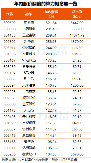 我国算力基础设施延续高景气 就国内市场而言,近年来,随着人工智能技术的快速发展,我国智能算力需求呈爆发式增长态势。 根据中国智算中心产业发展白皮书(2024年),AI大模型应用场景不断丰富,商用进程加快,智算中心市场增长动力逐渐由训练切换至推理,预计2028年中国智算中心市场规模有望达到2886亿元。 IDC与浪潮信息联合发布的《2025年中国人工智能计算力发展评估报告》显示,2025年中国智能算力规模将达到1037.3EFLOPS,预计到2028年将达到2781.9EFLOPS;2023-2028年,中国智能算力规模的复合增长率达到46.2%。 近日公布的“十五五”规划建议中明确提到,适度超前建设新型基础设施,推进信息通信网络、全国一体化算力网、重大科技基础设施等建设和集约高效利用,推进传统基础设施更新和数智化改造;加快人工智能等数智技术创新,突破基础理论和核心技术,强化算力、算法、数据等高效供给。宏观顶层设计为我国算力产业发展描绘了清晰的发展方向。 万联证券在研报中建议,可持续关注我国人工智能技术侧的研发创新、算力环节的加强建设以及应用端的规模化落地带来的投资机遇。 算力概念股年内集体大涨 资料显示,算力产业链的上游包括芯片、设备、能源等,中游是算力的整合与交付环节,下游则是算力的应用与消费方,涵盖互联网、金融、智能制造等千行百业。这条产业链上下协同,共同将原始的电力与硅基硬件,转化为推动数字经济发展的核心生产力。 ![]() (来源:东莞证券研报) 东方财富概念板块显示,目前A股市场共有170只算力概念股,包括13只超千亿市值的“大块头”,中国移动以2.31万亿元的总市值居首。 二级市场表现方面,超八成算力概念股年内股价实现上涨,其中22只个股的股价大涨超一倍,两大光模块龙头新易盛和中际旭创携手领涨算力概念股,前者年内涨幅高达321.64%,后者区间涨幅也接近三倍。第三名的工业富联年内大涨259.01%,总市值攀升至约1.49万亿元。 ![]() 在业绩层面,多数算力概念股也交出了亮眼的三季报答卷,共27家公司前三季度净利润同比增幅超100%(含扭亏为盈)。其中,北交所上市公司格利尔业绩增速居首,公司前三季度归母净利润1634.12万元,同比大增1271.07%。 奥瑞德前三季度实现归母净利润2.91亿元,同比大幅扭亏为盈。公司主要从事蓝宝石材料生产销售及算力综合服务等业务。在算力综合服务业务方面,公司构建了“算力弹性供给-智能运维管理-全生命周期服务”的一站式算力综合服务体系。 此外,前三季度净利同比增长超2倍的个股还有宏景科技、启迪设计、寒武纪、利通电子、海兰信、新易盛、康盛股份、大位科技、润泽科技。 ![]() 展望后市,甬兴证券研报认为,国内智算中心建设加速,产业链相关环节迎来增长机会。国产大模型加速国产算力建设,看好由国内智算中心建设带来AIDC运营商、AI服务器、交换机、光模块、高速铜缆以及温控等环节的放量机会。 (文章来源:东方财富研究中心) |