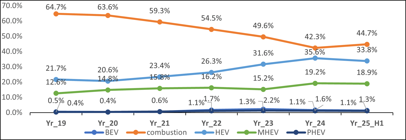 电动车洼地:日本市场电动化渗透率长期在2%左右徘徊 作为全球第四大汽车消费市场,日本的汽车电动化转型进程颇为特殊:油电混合动力汽车(HEV,核心特点是无需外接充电,而是通过发动机运转和动能回收系统为电池充电)在市场中占据绝对主导地位。与之形成对比的是,纯电动汽车在日本的发展进程遭遇瓶颈,渗透率长期处于极低水平。 汽车行业数据与咨询服务提供商JATO Dynamics发布的数据显示,2019年,日本纯电动汽车的市场份额仅为0.5%,在2023年爬升至2.2%后,2025年上半年又回落至1.3%,在发达国家中最低。 ![]() 日本市场不同动力车型注册量对比,来自JATO Dynamics官网 一方面,日本本土市场长期依赖油电混动车型。身为汽车强国之一,日本汽车产业围绕内燃机技术构建了庞大的产业链体系,丰田、本田等头部企业在油电混合动力领域的技术积累已形成护城河。以丰田为例,其每年高达千万辆左右的销量中,40%以上为油电混动车型。这种技术优势也塑造了日本社会对传统汽车工业优势的文化认同。 另一方面,面对未来技术,日本押注了氢燃料电池汽车,对纯电路线的投入严重不足,这还被业内戏称为“点错了科技树”。以上多种因素直接导致本土电动化进程滞后。 从车型来看,日本在售纯电动车型从2019年的10款增加至2025年的61款。但其中仅有10款来自日本品牌,其余51款均为外国品牌。除销量最高的日产樱花外,仅有特斯拉Model 3、比亚迪海豹等外资品牌车型在市场中稍有存在感。 从销量更能直观看出电动车型在日本市场上的不温不火:2024年,日本品牌在本土市场的市占率超94%,掌握绝对话语权;然而在纯电动车型排行榜上,外资品牌却可与本土品牌掰掰手腕。以全球最受欢迎的纯电动汽车品牌之一特斯拉为例,其去年在日本市场的总销量也仅有5600辆,位列纯电品牌销量第二位。 比亚迪从三年前才刚进入日本乘用车市场,去年其纯电车型销量已经升至第四,超越了丰田、本田等本土巨头。 面对日本本土市场电动化转型的低迷,比亚迪、特斯拉、现代等国际品牌正加速渗透。但日系品牌在本土市场占据主导地位,“日本电动汽车渗透率的明显上升,要看日本品牌电动车的推出。”比亚迪亚太汽车销售事业部总经理刘学亮在接受澎湃新闻等媒体采访时表示。 电动车型终于站上车展C位,丰田等本土巨头加速电动化进程 从日本移动出行展上的新车不难看出,日本车企已经摆脱了对电动化半推半就的态度——纯电动车型站上了多个展台的C位。 全球第一大车企丰田在日本移动出行展的媒体发布会上公开了卡罗拉概念车型,并表达了推出纯电版本的意向。这被业内解读为日本车企向电动化转型的标志性动作。 卡罗拉于1966年上市,是丰田以及日本汽车产业的代表车型,年销量长期超百万辆,目前其全球累计销量早已突破5000万辆,是史上销量最高的车型。 在另一日本巨头本田的展台,同样显示出了其打开纯电产品线的决心:全球首发“Honda 0 α”是本田旗下0系列的全新SUV原型车,与“Honda 0 SALOON”和“Honda 0 SUV”原型车共同登上展台。 此外,本田还全球首发了一款小型纯电动原型车Super-ONE Prototype。据悉,该车型计划于2026年在日本上市。 铃木首次公开了力争2026年度量产的轻型EV的试制车“Vision e-Sky”,同时该公司还表示,日本的电动汽车普及进程将会提速。 此外,雷克萨斯带来了全球首发的LS六轮电动MPV概念车;奔驰AMG纯电高性能概念车也迎来亚洲首展;日产、现代等也都展出了纯电动车型或概念车。 中国车企方面,除了全面进入日本市场的比亚迪外,极氪的009车型也通过经销商首次在日本公开亮相,试图进入日本纯电市场。 电动汽车在日本汽车市场上的逐步兴起,将不仅利好有意出海的中国电动汽车品牌,也将进一步增强中国汽车产业在国际上的话语权,尤其是以动力电池为代表的产业链。 从原材料到电池单元,车载电池整个供应链对中国的依赖度都很高。日本矢野经济研究所的调查显示,从正极材料和负极材料等4大主要材料来看,中国的市场份额全部超过9成。日经新闻评价称,“虽然全球越来越多的国家在竞相吸引电池制造商到本国,但供应链想要摆脱中国极为困难。” 值得一提的是,日经新闻分析认为,电动汽车在日本普及的关键是价格,而日本电动汽车市场已经迎来降价潮。 日产在10月8日宣布,改款主力电动车LEAF在日本起售价约519万日元,相较旧款降低了约6万日元;比亚迪9月在日本针对所有车型进行了限时降价,同时对最新上市的新款海豹进行增配降价;丰田也在10月将量产电动车bZ4X的价格下调了70万日元。 铃木社长铃木俊宏在接受日媒采访时说,“日本人对中国产品的(购买)门槛正在降低。我认为(比亚迪)是一个巨大的威胁。”他虽然表示不会就价格展开竞争,但同时称“将在参照其他厂商的同时推进讨论”。 (文章来源:澎湃新闻) |